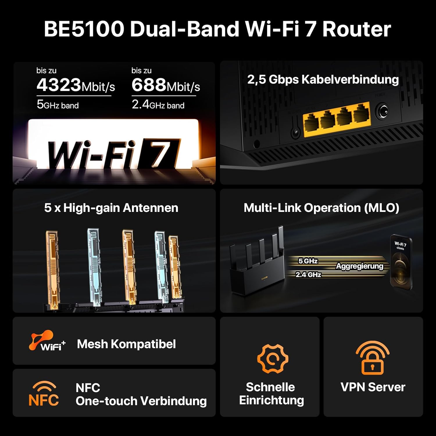 Tenda RE6L Pro Wi-Fi 7 рутер (BE5100 двубандов 4323Mbit/s 5GHz, 688Mbit/s 2.4GHz) вертикални антени, Wi-Fi+, 1x2.5Gbps + 3xGigabit WAN/LAN порта, MLO, 4K-QAM, NFC, VPN, WPA3, VR/AR игри/8K