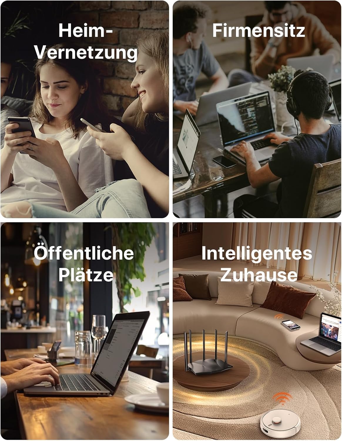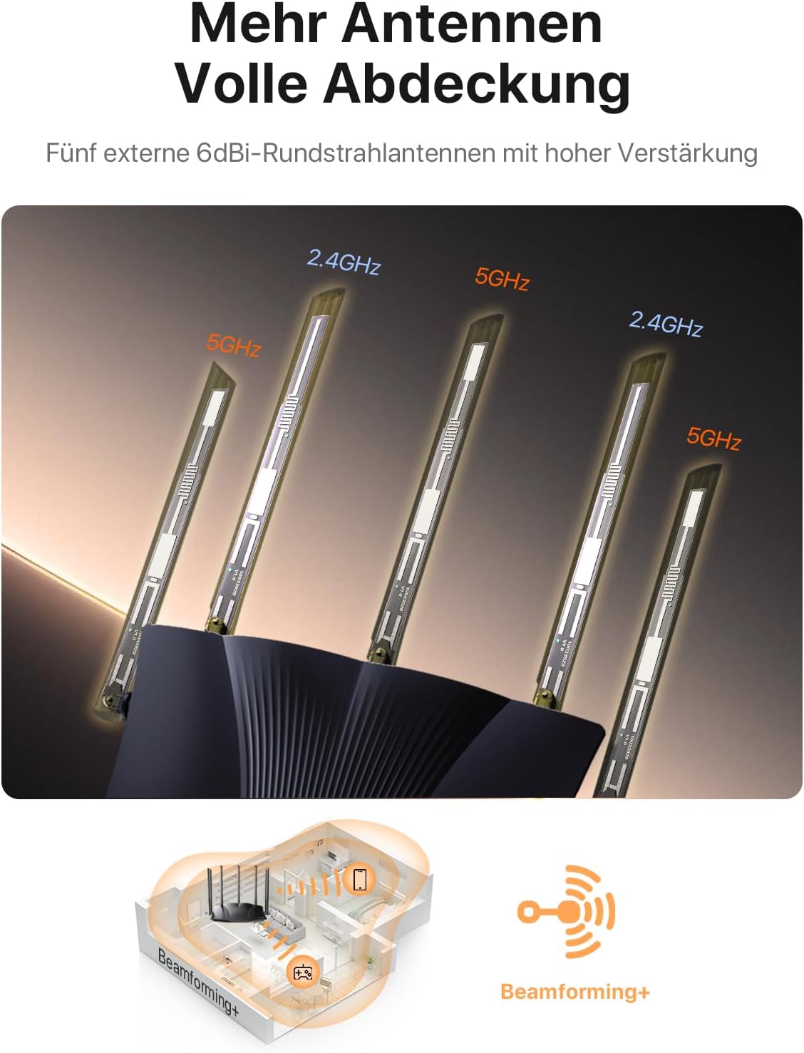 • 【Широко покритие】 5 x 6 dBi високопроизводителни антени с насочено предаване на сигнала Beamforming+ целят да подобрят сигнала във вашето местоположение, за да подобрят Wi-Fi покритието и качеството на сигнала по-ефективно, осигурявайки силен и неудържим сигнал, който прониква през стени.