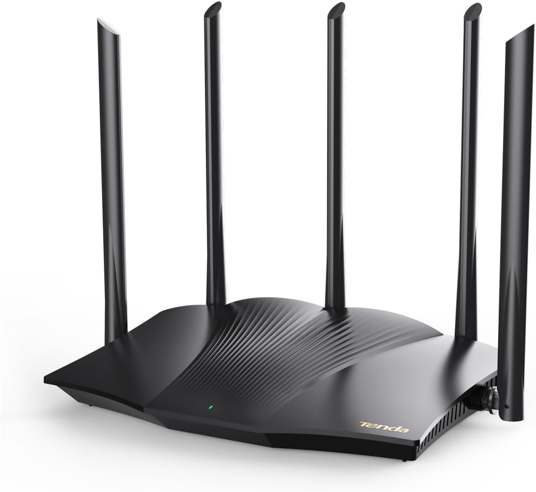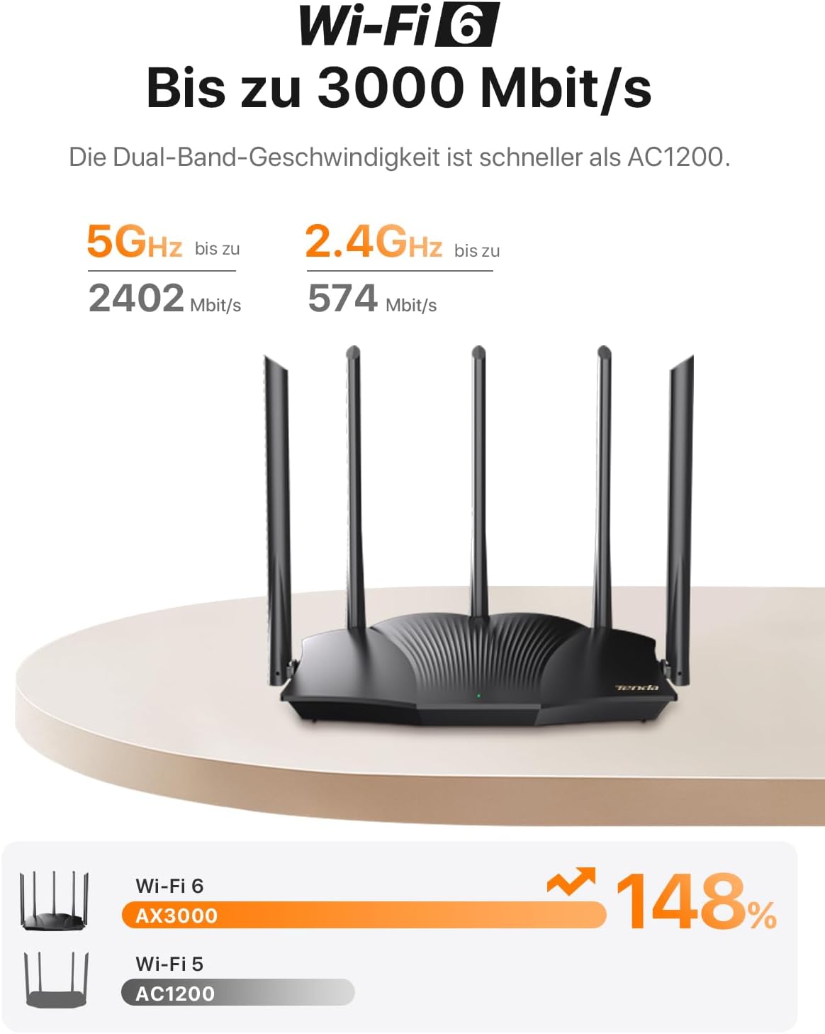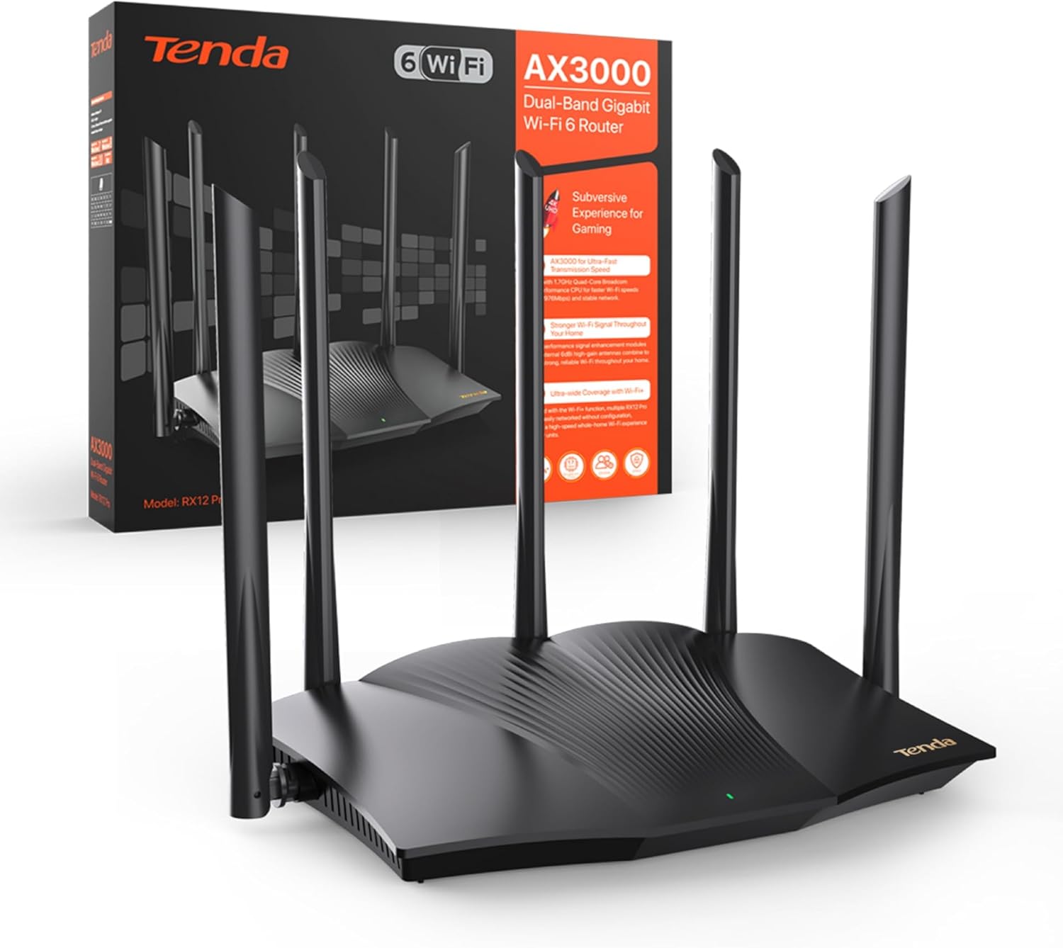 Tenda RX12 Pro Wi-Fi 6 WLAN рутер (AX3000 двубандов 5GHz: 2402Mbps + 2.4GHz: 574Mbps) 5 x 6dBi антени с високо усилване, гигабитов LAN/WAN порт, WPA3, MU-MIMO + OFDMA, WiFi + Mesh, VPN, приложение, без DSL функция, черен