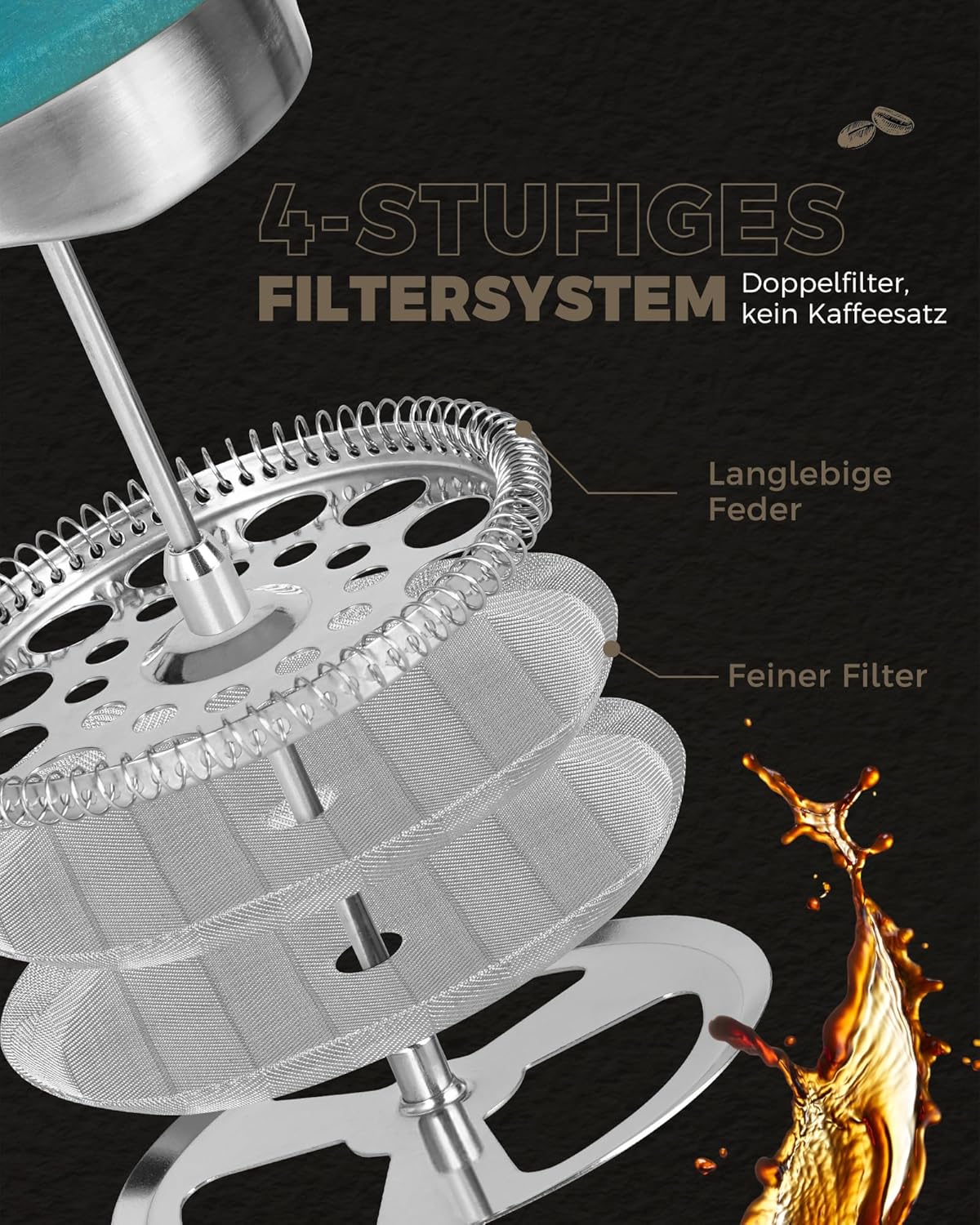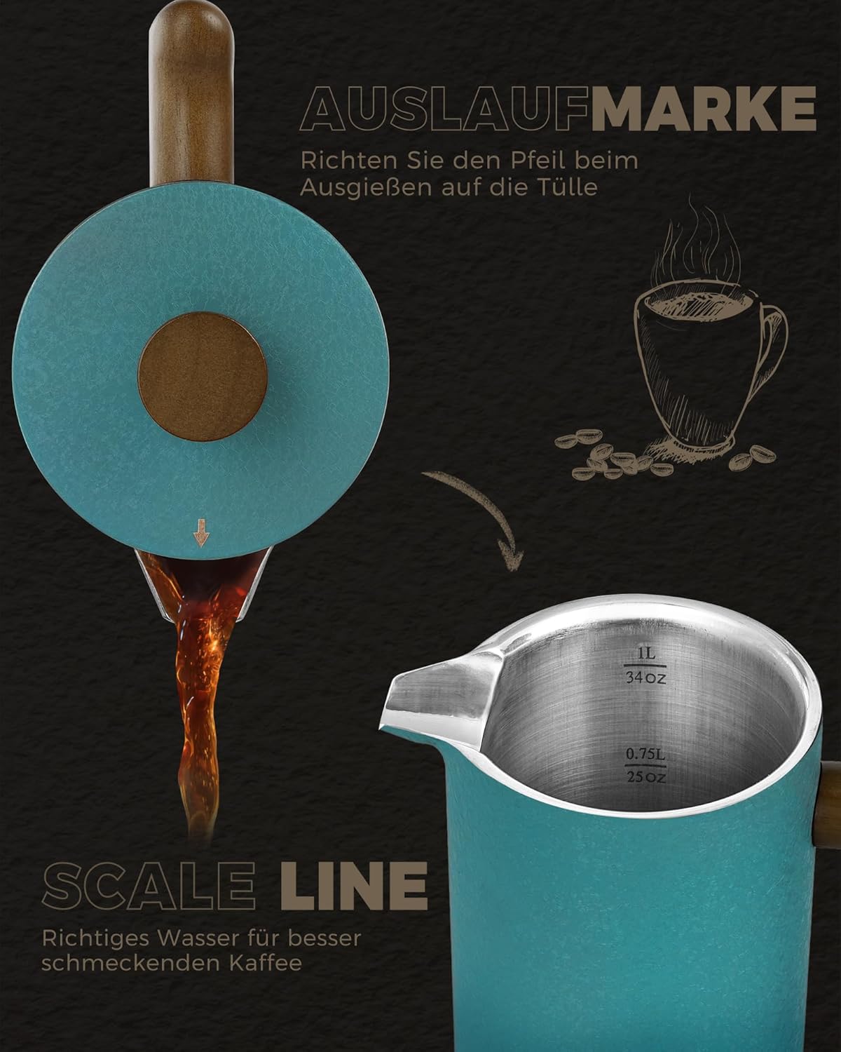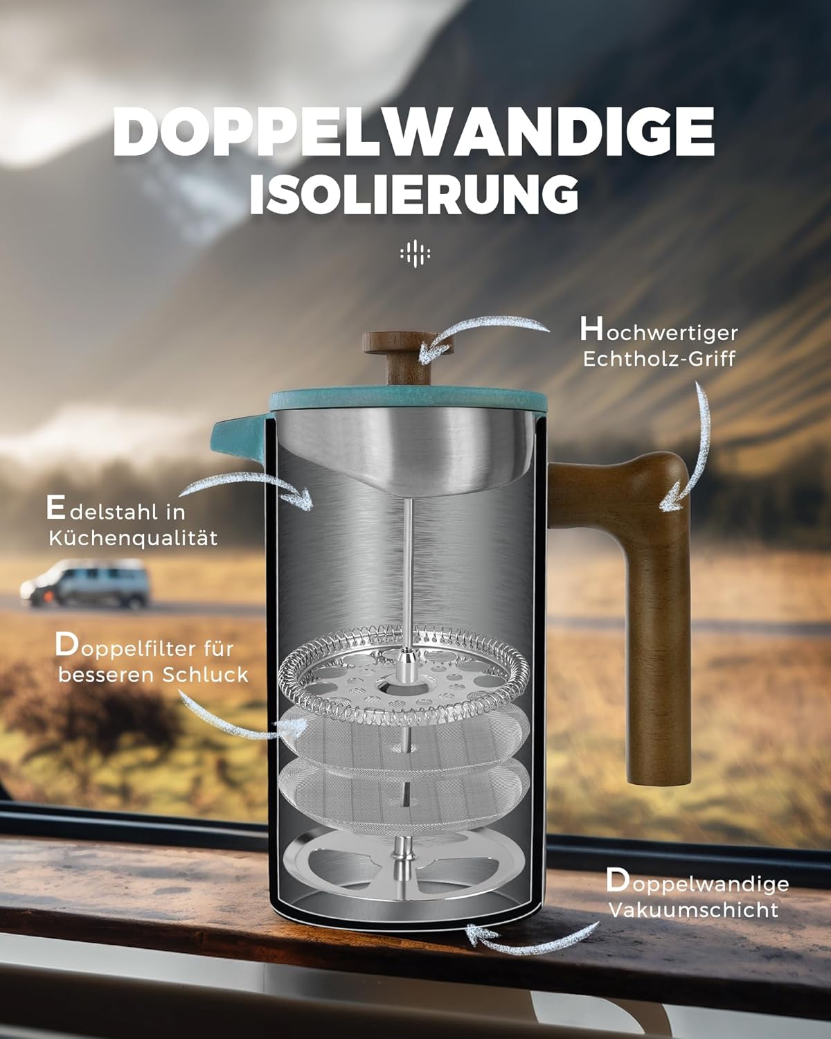 • Двустенна изолация: Нашата кафеварка с двуслойна конструкция е изработена от двустенна неръждаема стомана, така че можете да поддържате кафето си топло за по-дълго време, отколкото стъклена френч преса. Средно напитките остават топли за 60 минути по-дълго. Следователно, кафеварката поддържа кафето или чая топли за по-дълго време, като при допир отвън не се усеща твърде горещо.