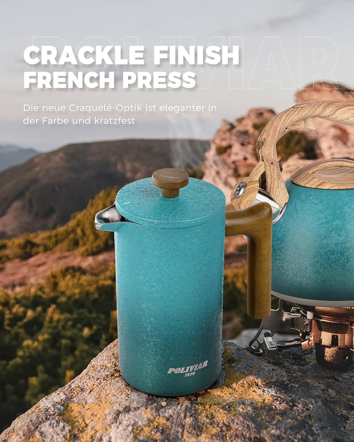 • Изключително издръжлива: Кафемашината Poliviar е изработена от изключително висококачествена неръждаема стомана (304), която е особено издръжлива благодарение на своята здравина и прецизна изработка. В сравнение с други стъклени преси, нашите френски преси от неръждаема стомана са по-безопасни и по-подходящи за употреба на открито.