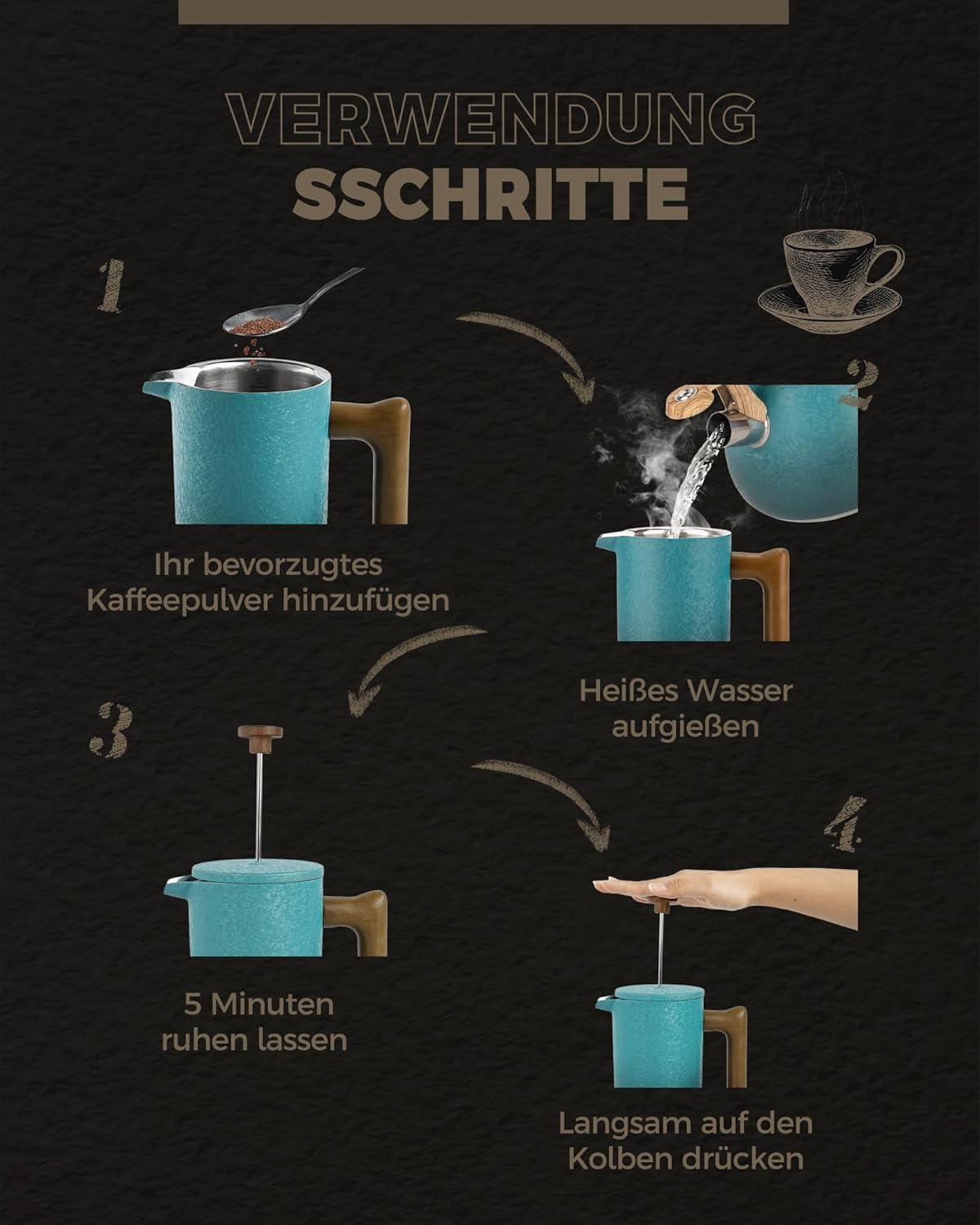 • Перфектни подаръци: Идеална като машина за кафе или чай. Подходяща също за горещо мляко, шоколад, плодов чай, лимонада. Независимо дали сте у дома или на път, за къмпинг, пътуване или пикник, тази преса за кафе е незаменим спътник. Идеален подарък за всички любители на кафето, любители на „Направи си сам“ и здравословни гастрономи!