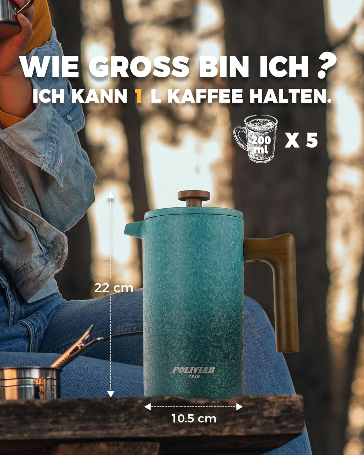 Термокафемашина Poliviar French Press от неръждаема стомана с двойни стени изолирана кафемашина 1 литър, ръчна филтърна преса за кафе с бутало и дървена дръжка