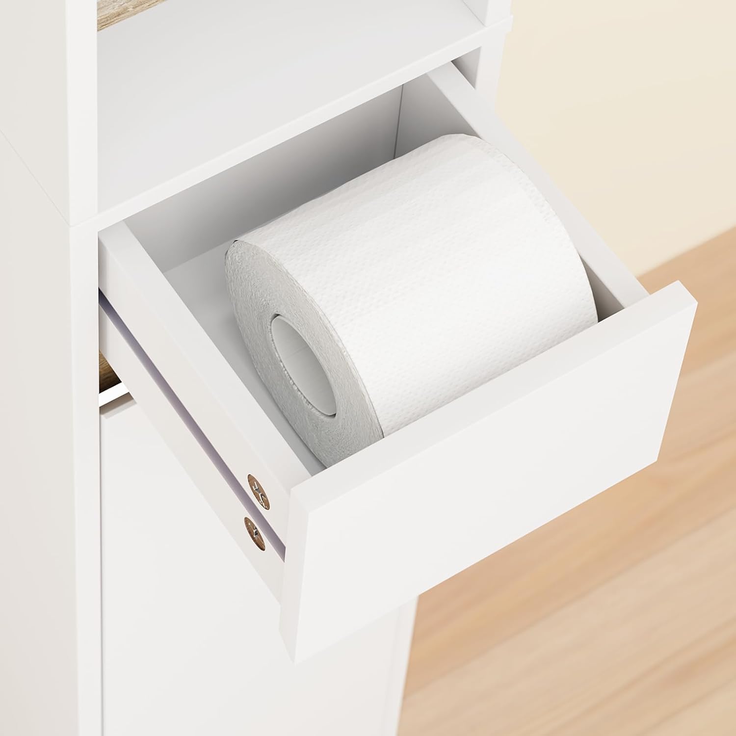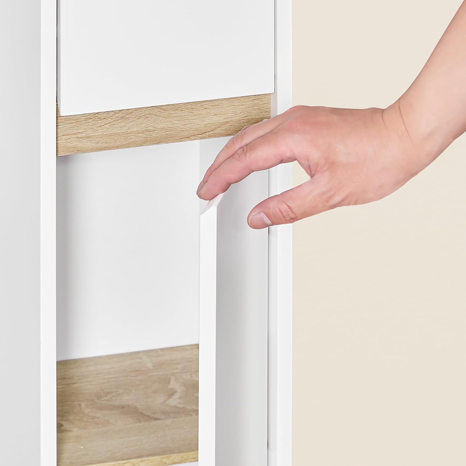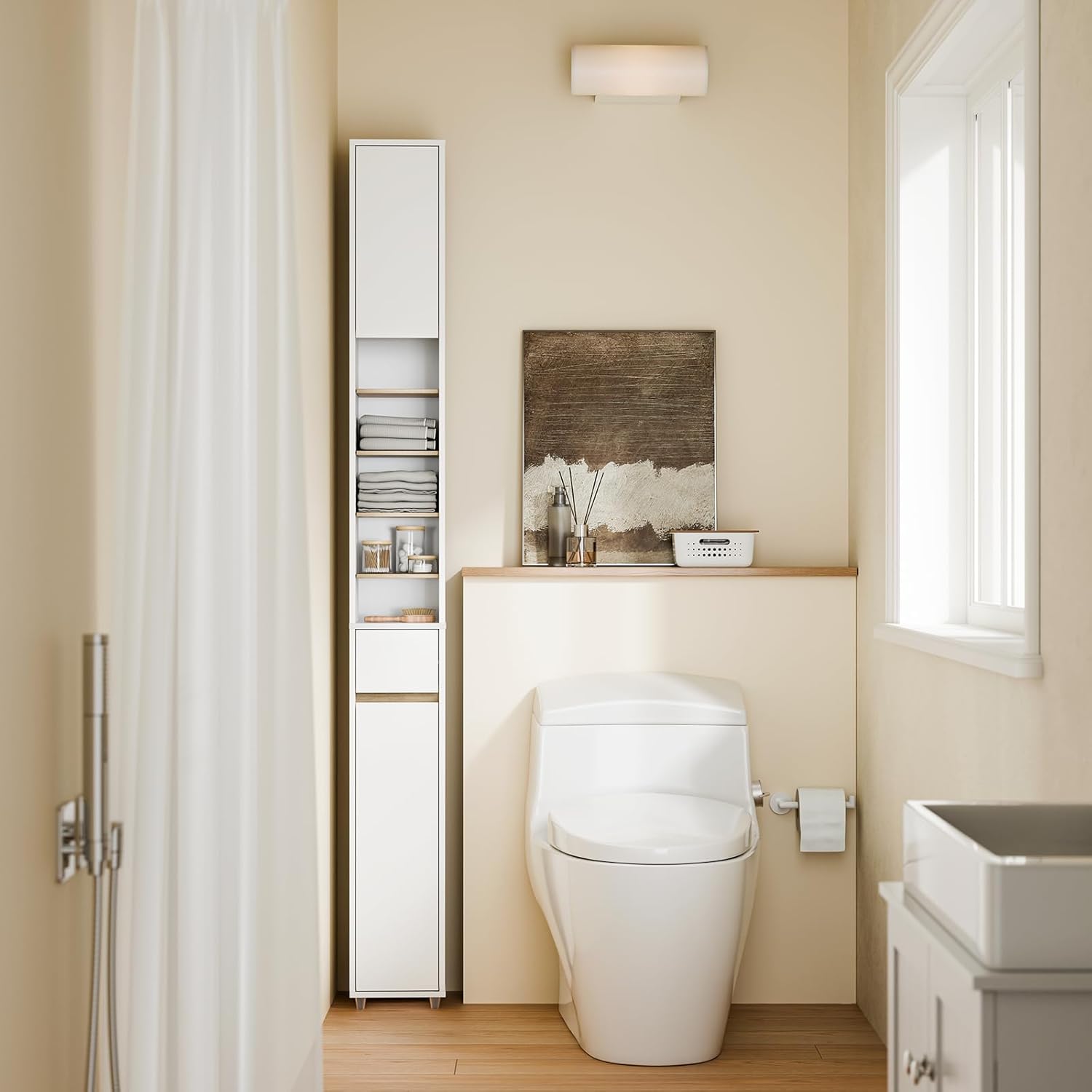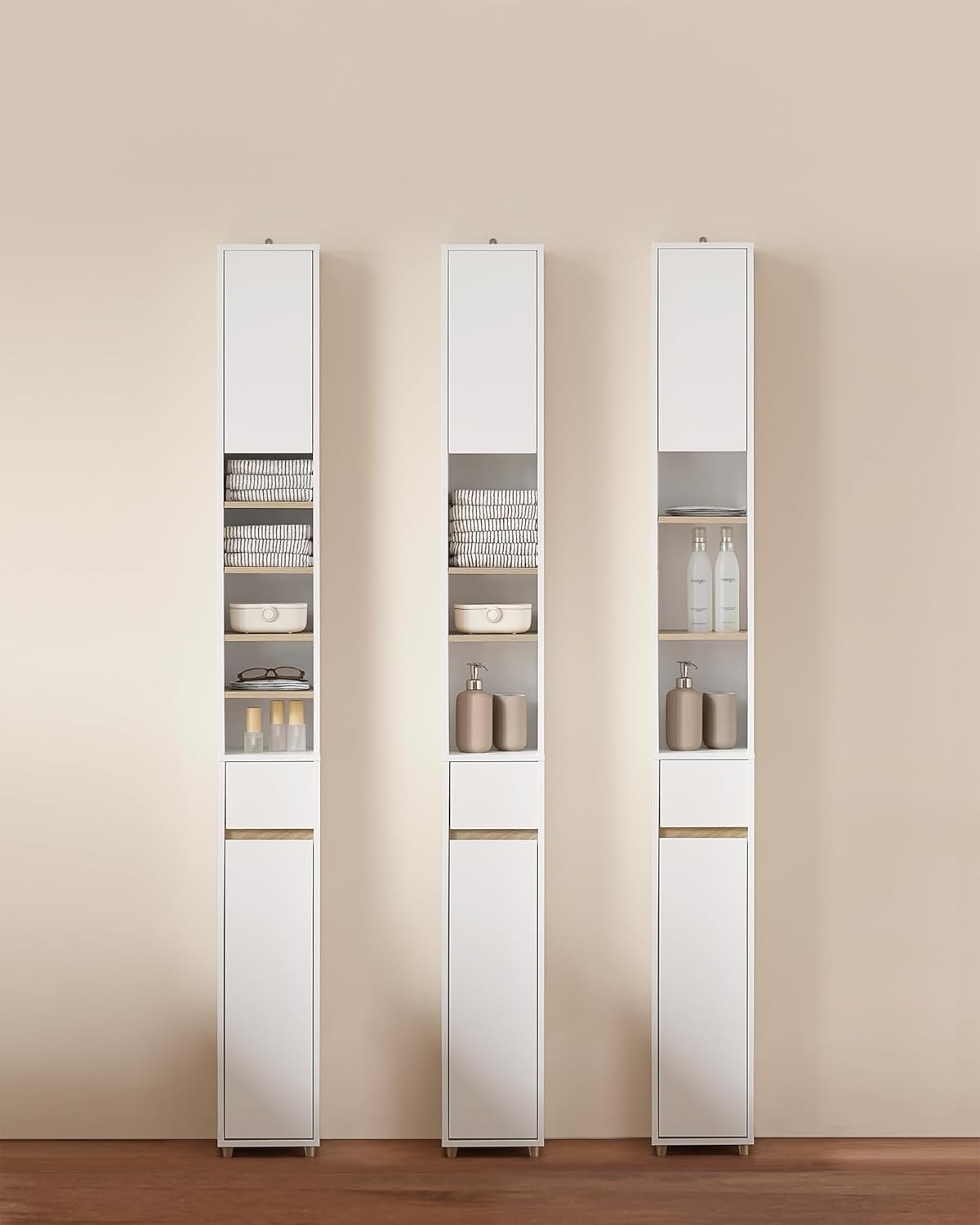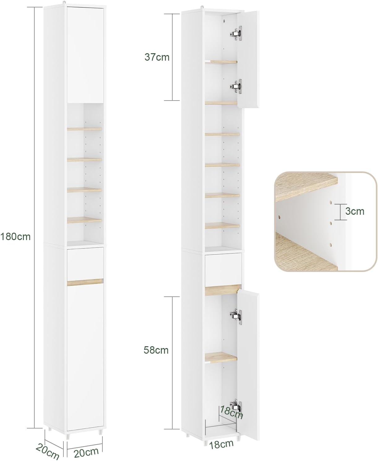 • [ТЪНЪК И УНИВЕРСАЛЕН]: Само 20 см ширина, идеален за тесни бани, коридори, спални или дори дневни - стилен висок шкаф за баня, който се възползва максимално от всяка стая и създава ред