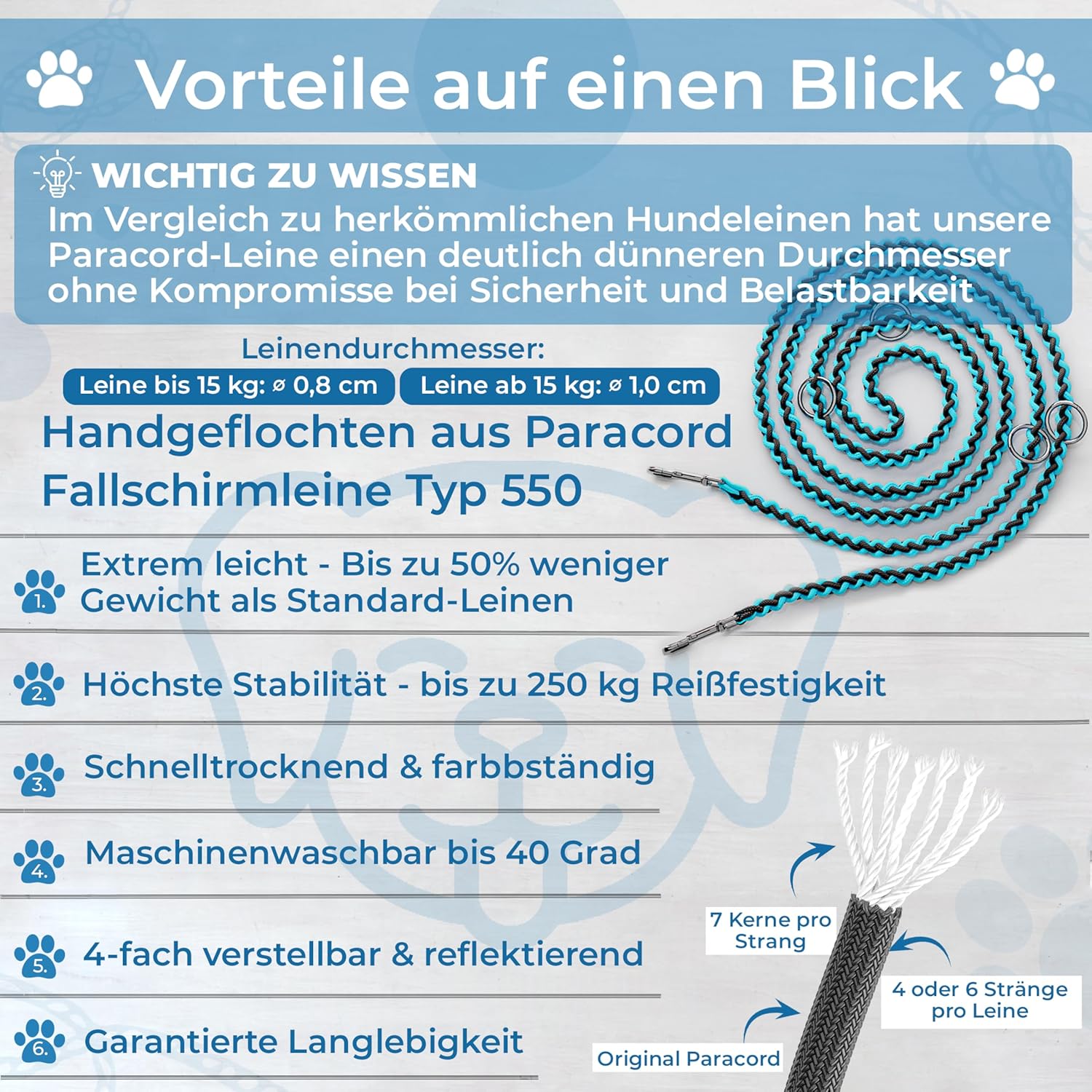 Тестова бележка: много добър светлоотразителен повод за куче, 3 м, регулируем, устойчив на атмосферни влияния и разкъсване до 250 кг, повод от паракорд, повод за през рамо, за малки и големи кучета
