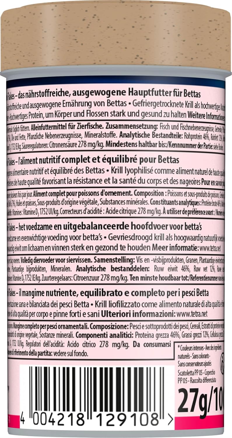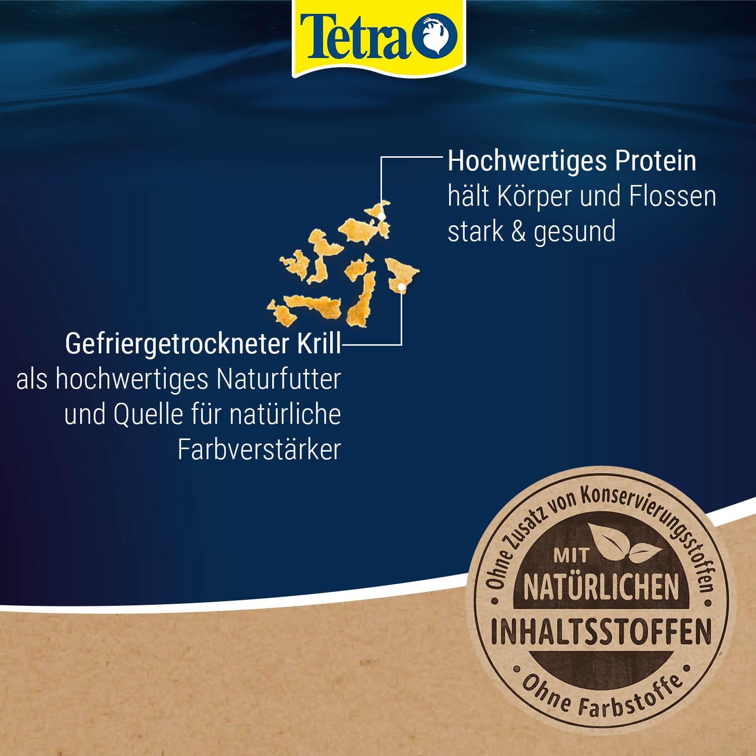 Състав: Риба и рибни продукти, зърнени храни, екстракти от растителни протеини, дрожди, мекотели и ракообразни (крил 6,7%), масла и мазнини, растителни странични продукти, минерали. Аналитични съставки: Суров протеин 46%, сурови мазнини 12%, сурови фибри 2%, съдържание на влага 8%. Добавки: Витамини: Витамин D3 1752 IU/кг. Регулатори на киселинността: Лимонена киселина 278 мг/кг.