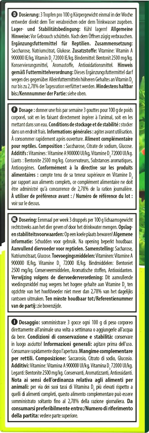 Прилагайте 3 капки на 100 г телесно тегло веднъж седмично, директно на животното или добавени към водата за пиене.
