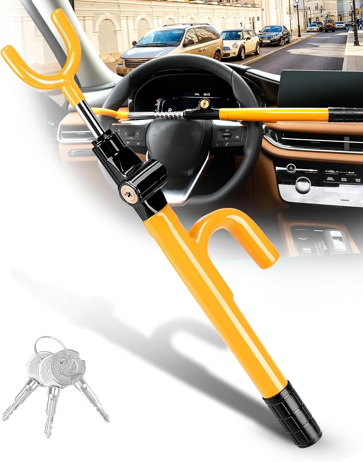 Tevlaphee заключване на волана, автомобилна ключалка, висококачествено устройство против кражба, висока видимост, универсално за автомобили, SUV-ове и микробуси, регулируемо, 3 ключа (черно)