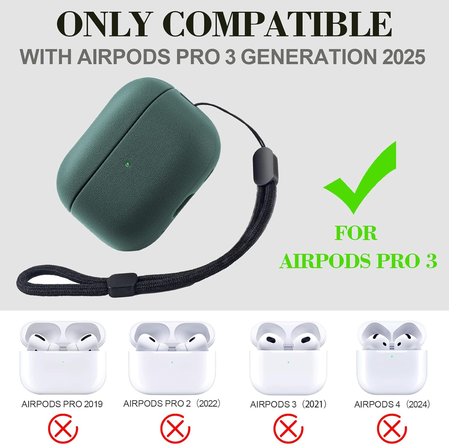 Teyomi TPU калъф за AirPods Pro 3-то поколение, защитен калъф за Apple Airpods Pro 3 с каишка за ръка, кожен калъф с тъч дизайн за Airpods Pro 3 (тъмнозелен)