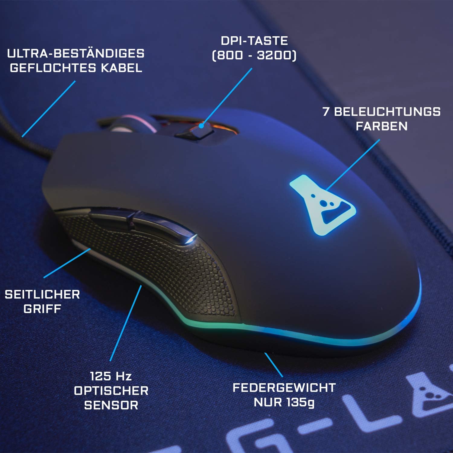 • Ултра-реактивна мишка с подсветка. Кабелна USB геймърска мишка с висока прецизност и по-отзивчив оптичен сензор, отлична за всякакви игри. Чувствителност, регулируема от 1200 до 3200 DPI. Ярка подсветка в 4 различни цвята, по един за всяко ниво на DPI. Честота на опресняване 125 Hz, изключително издръжлив оплетен кабел. Ергономичен дизайн, удобен захват за всички размери ръце. Лека геймърска мишка с тегло само 153 грама.