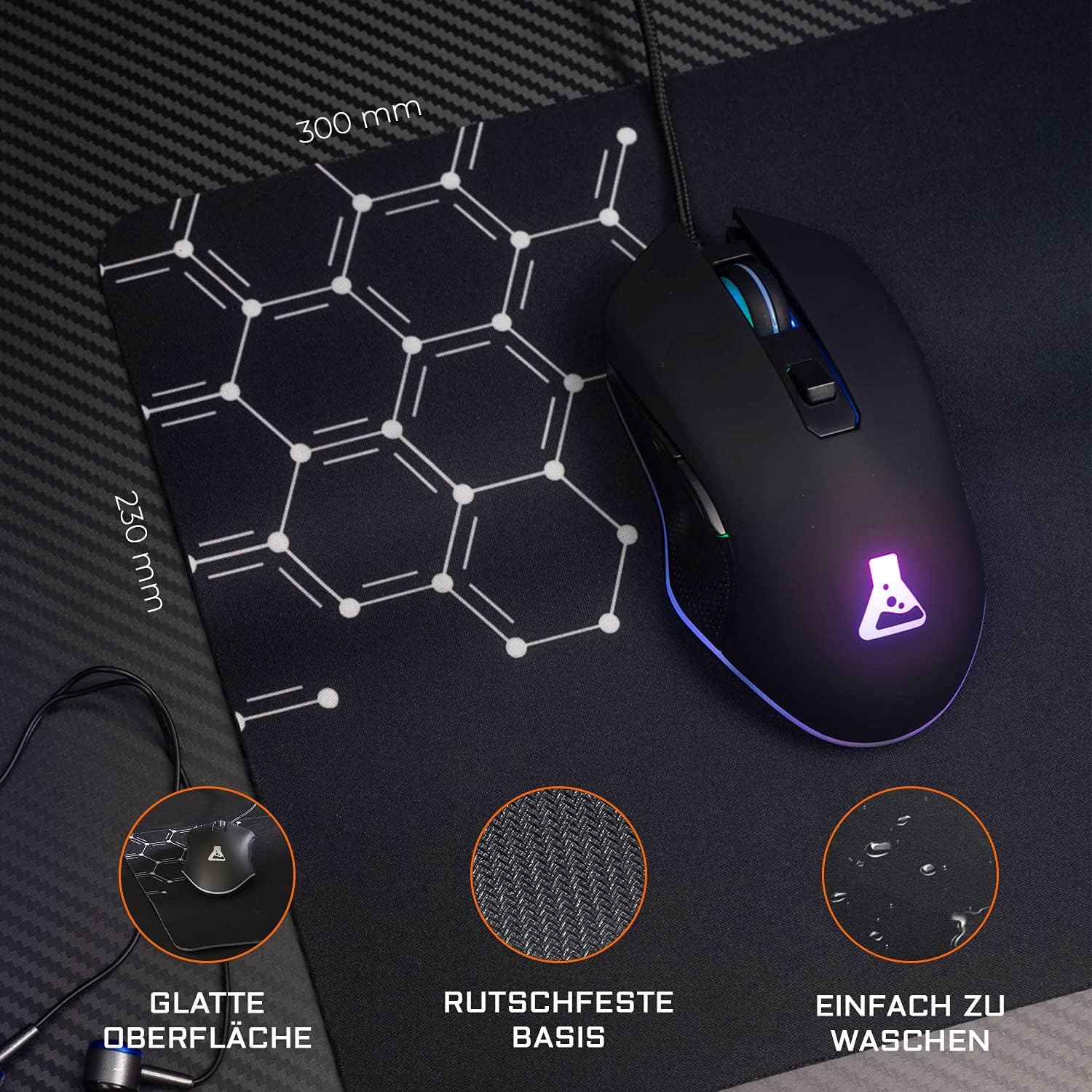 • Неплъзгаща се подложка за мишка. Подложка за мишка 300 x 230 x 2 мм, изработена от висококачествена материя, много издръжлива. Гладка и удобна текстура за перфектно плъзгане на мишката. Неплъзгаща се гумена основа за по-добра стабилност. Постигнете точност и скорост. Оптимизирана повърхност за проследяване на всички движения на мишката, дори и най-бързите. Геймърска подложка за мишка, лесна за носене, може да се пере с вода и е силно устойчива на естествено износване.