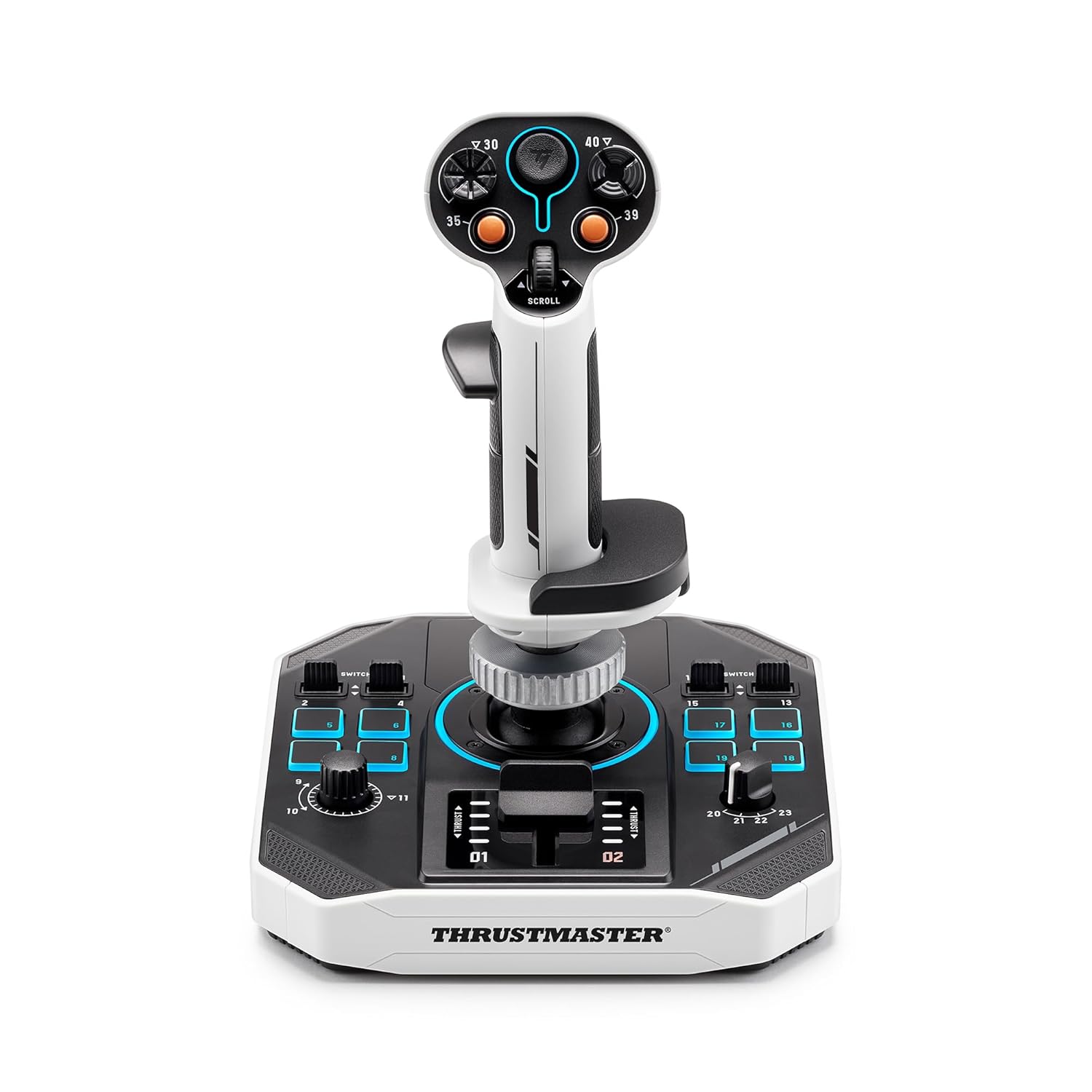 С джойстика Sol-R 1, космосът е ваш. Той е проектиран да си създадете име в галактиката! С този прецизен, двуличен джойстик можете да се впуснете в епични битки и космически приключения, които са извън този свят. С неговите 3 оси за движение (X, Y и Z) и 5 виртуални оси (колелце с палец, лост за натискане, мини джойстик), вашият космически кораб може да бъде умело управляван. Универсалните контроли на Sol-R 1 Flightstick включват бутони, превключватели, спусъци (1 спусък с две позиции) и превключвател тип „шапка“, който ви позволява да извършвате до 44 действия без усилие. Оставете отпечатък с емблематичния дизайн на този осветен джойстик. Издигнете настройката си на следващото ниво: Sol-R 1 Flightstick е съвместим с базата AVA*. Освен това, базата Sol-R е проектирана за съвместимост с настоящи* и бъдещи* дръжки Thrustmaster. (*продават се отделно).