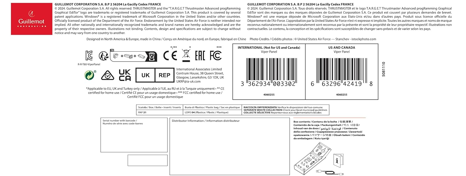 Бъдете готови за опасната зона с панела Viper, който е базиран на контролите в пилотската кабина на Viper, световноизвестният модерен многоцелеви боен самолет, и е официално одобрен и лицензиран от Военновъздушните сили на САЩ. След години на разработване на Hotas Warthog, Thrustmaster с гордост пуска нов, усъвършенстван контролен панел на Viper, който е в традицията на емблематичния Hotas Cougar от Thrustmaster. Това реалистично копие на Viper за компютърни контроли предлага първокласно усещане с металните бутони и реалистичните контроли - включително лост за окачване и функция за спускане (за аварийни ситуации). Панелът е с подсветка и има регулируеми индикаторни светлини на контрола на окачването и панела TWA (Threat Warning Aux) за абсолютен реализъм! Панелът Viper е проектиран за интензивни излитания, битки и кацания с 43 метални бутона за действие (включително 11 виртуални бутона), колело за подрязване (ос), въртящи се превключватели MODE и PGRM на панела CMDS, както и превключватели за лазерен мерник, заглушител и изстрелване на оръдие. Разгърнете потенциала на Viper Panel, като разширите възможностите си за полет и бой с отделно продаваната Viper TQS (Throttle Quadrant System). Долната част на Viper TQS може да се отдели, за да се монтира Viper Panel и да се завърши Viper изживяването. Viper TQS е съвместим с PC и може да се използва като plug-and-play версия в DCS World без нужда от настройка: устройството се разпознава автоматично в играта.