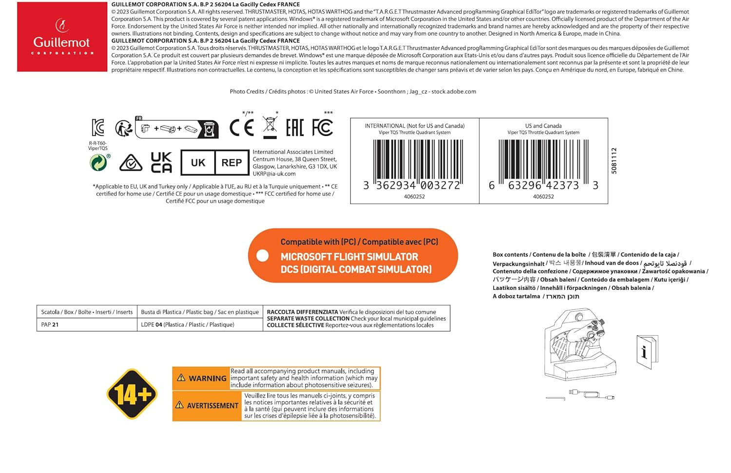 Бъдете готови за опасната зона с панела Viper, който е базиран на контролите в пилотската кабина на Viper, световноизвестният модерен многоцелеви боен самолет, и е официално одобрен и лицензиран от Военновъздушните сили на САЩ. След години на разработване на Hotas Warthog, Thrustmaster с гордост пуска нов, усъвършенстван контролен панел на Viper, който е в традицията на емблематичния Hotas Cougar от Thrustmaster. Това реалистично копие на Viper за компютърни контроли предлага първокласно усещане с металните бутони и реалистичните контроли - включително лост за окачване и функция за спускане (за аварийни ситуации). Панелът е с подсветка и има регулируеми индикаторни светлини на контрола на окачването и панела TWA (Threat Warning Aux) за абсолютен реализъм! Панелът Viper е проектиран за интензивни излитания, битки и кацания с 43 метални бутона за действие (включително 11 виртуални бутона), колело за подрязване (ос), въртящи се превключватели MODE и PGRM на панела CMDS, както и превключватели за лазерен мерник, заглушител и изстрелване на оръдие. Разгърнете потенциала на Viper Panel, като разширите възможностите си за полет и бой с отделно продаваната Viper TQS (Throttle Quadrant System). Долната част на Viper TQS може да се отдели, за да се монтира Viper Panel и да се завърши Viper изживяването. Viper TQS е съвместим с PC и може да се използва като plug-and-play версия в DCS World без нужда от настройка: устройството се разпознава автоматично в играта.