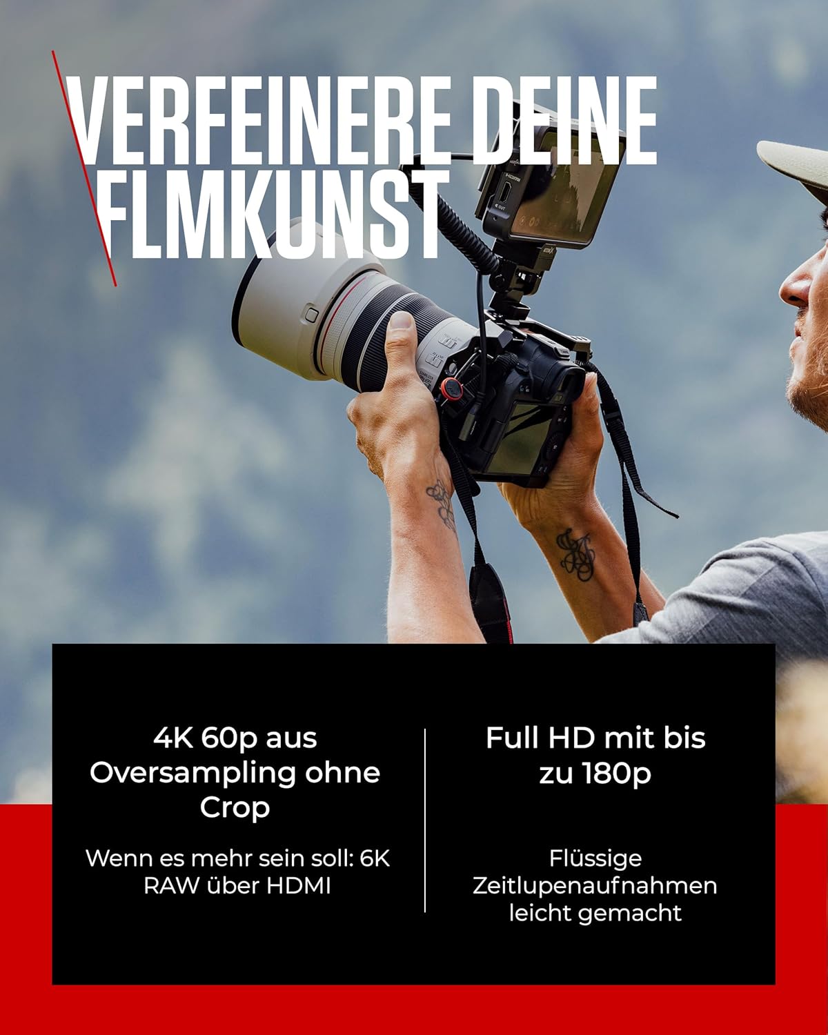 • Пълноформатно качество – компактният системен фотоапарат предлага всички предимства на пълноформатния формат благодарение на двупикселовия CMOS AF II сензор с изкуствен интелект и 24,2 мегапиксела. Възможен е запис на 4K 60p UHD видео и 6K RAW записи.
