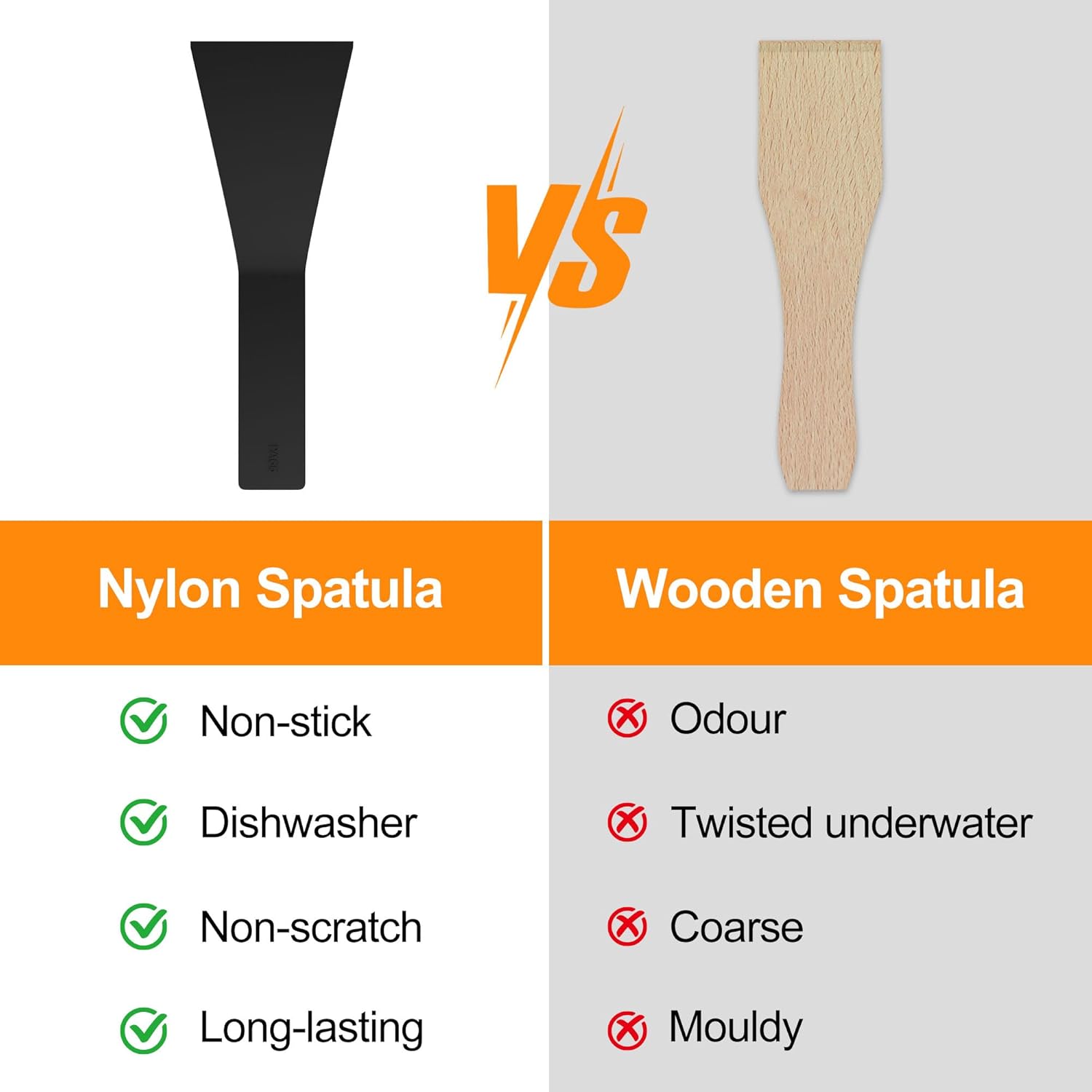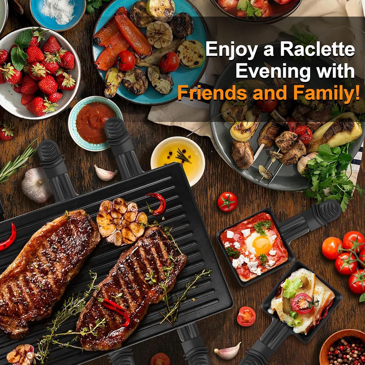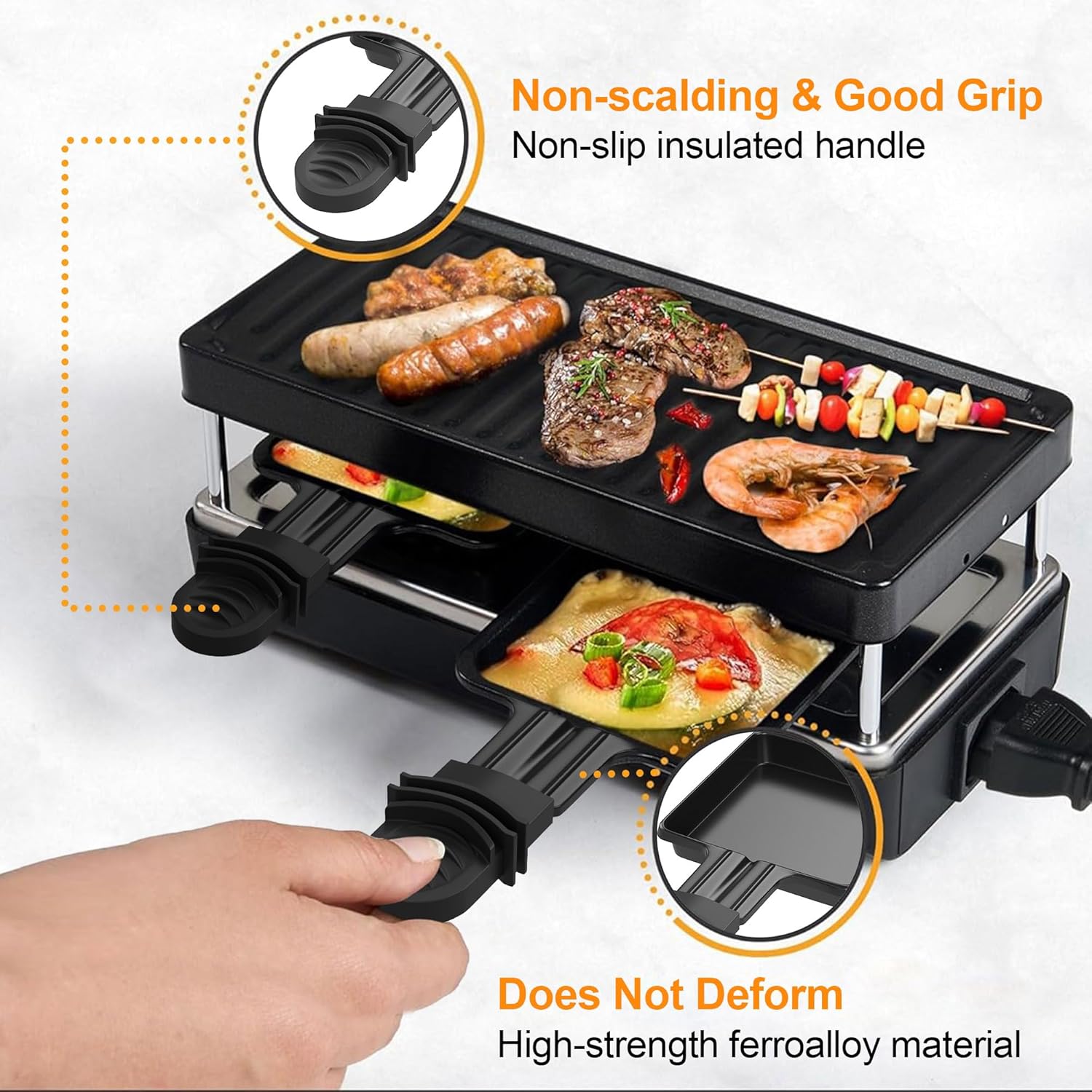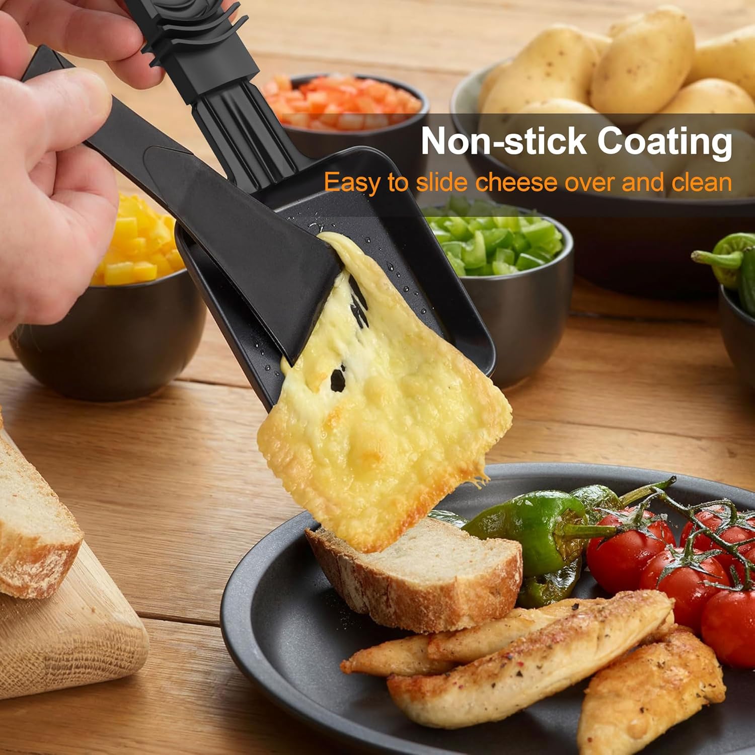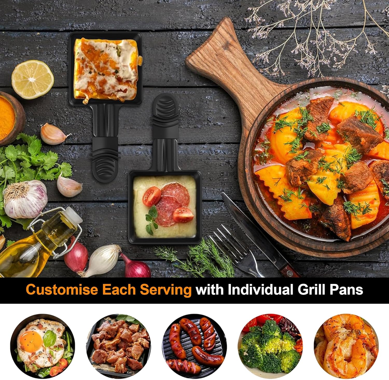 • Премиум качество: мини тиган за раклет, изработен от висококачествен метал, здрав и издръжлив, незалепващ, устойчив на топлина и безопасен за храна. Идеален за печене на скара, запичане и разстилане на храна без изгаряне. Включените найлонови лъжички за лесно обръщане на храната, безопасни, нетоксични и за многократна употреба.