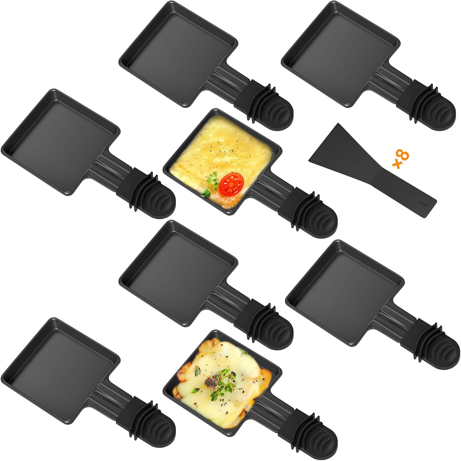 • Компактен дизайн: тигани за раклет в комплект от 8 броя за приготвяне на раклет за 8 души, универсално съвместими със стандартни устройства за раклет грил. Квадратна форма с модерен и компактен дизайн, размери: 18,35 x 9,23 x 1,45 см.