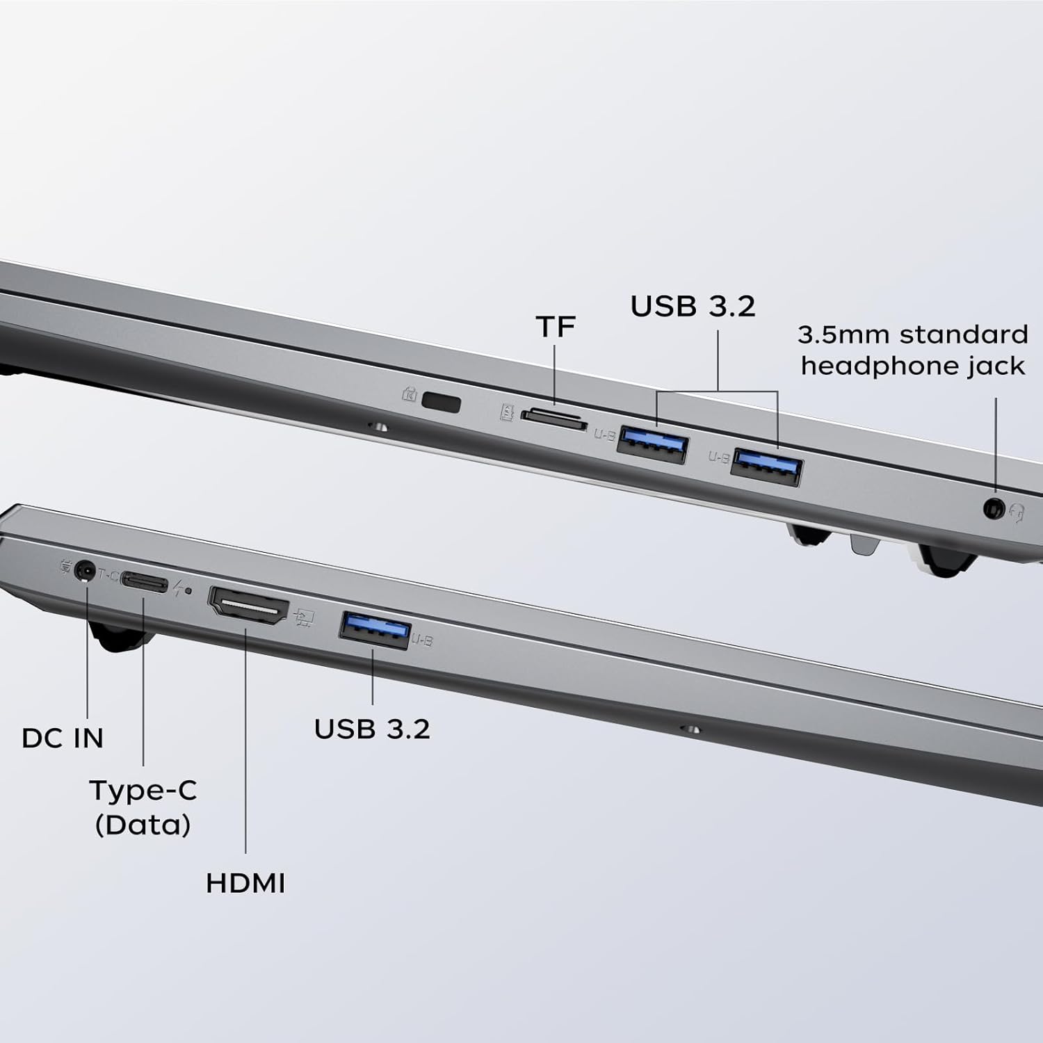 • 【Разнообразни интерфейси】Този лаптоп е оборудван с разнообразни интерфейси, за да отговори напълно на вашите ежедневни нужди. Лаптопът разполага с 3 USB 3.2 порта, 1 HDMI порт, 1 Type-C (порт за данни), 3,5 мм стандартен жак за слушалки, DC захранващ порт, слот за карта с памет и 2 високоговорителя.