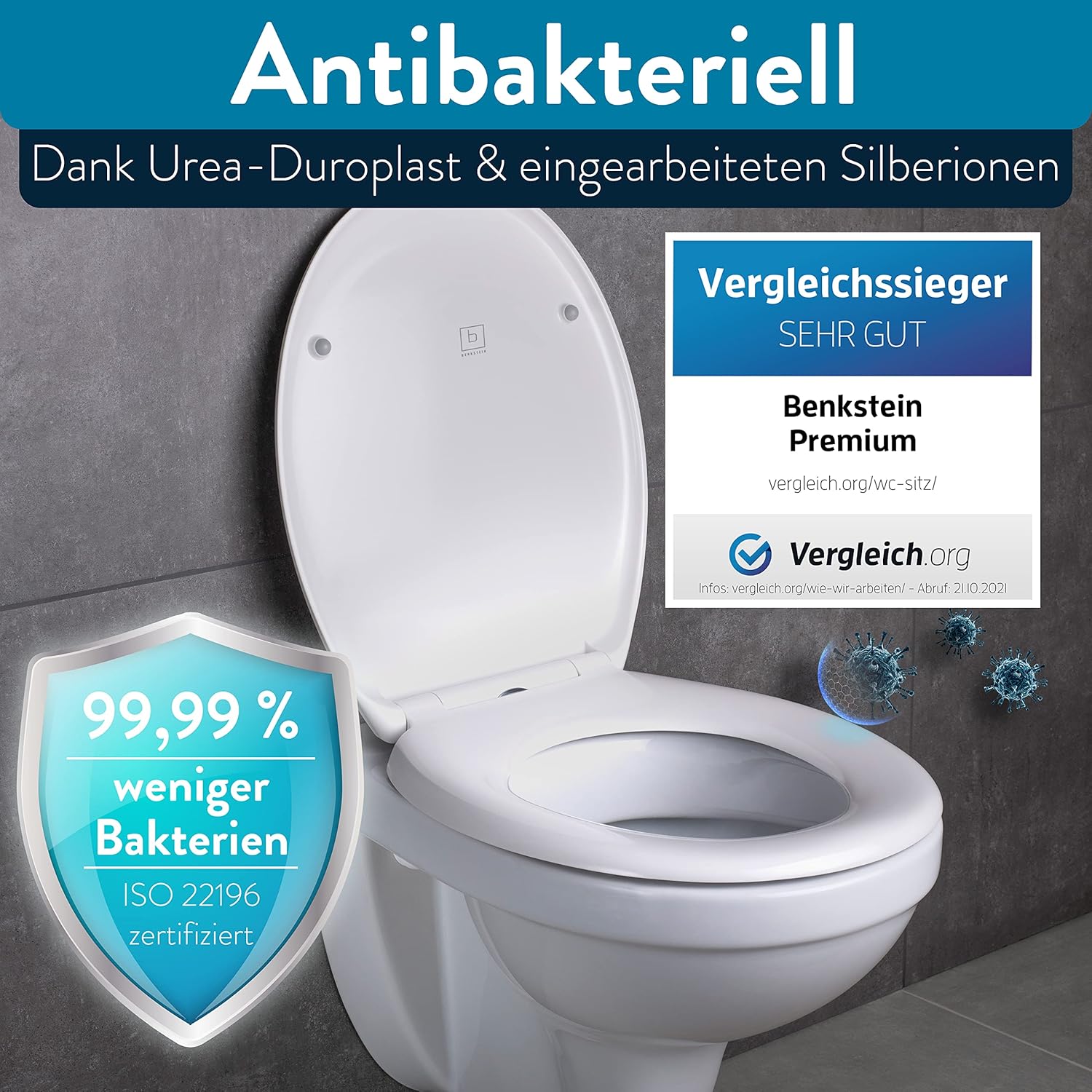 Тоалетна капачка Benkstein® Premium, антибактериална, дуропластова тоалетна капачка с функция за бързо освобождаване и механизъм за плавно затваряне, тоалетна седалка от устойчива на ръжда неръждаема стомана, подвижна тоалетна седалка, овална