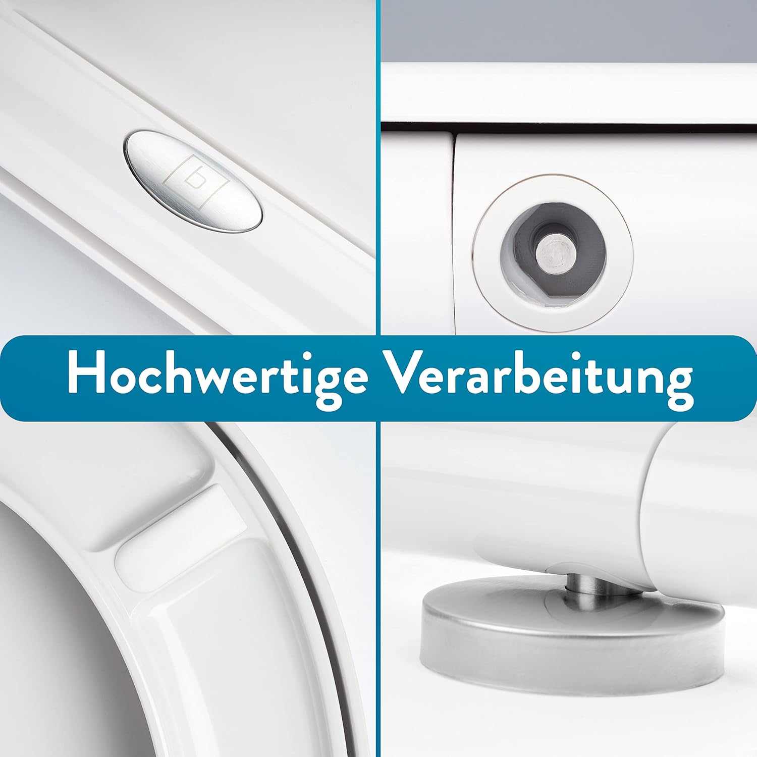 • Устойчив на цвят урея дуропласт: Евтината пластмаса пожълтява с времето. Затова използваме само висококачествена пластмаса урея дуропласт за производството на нашите тоалетни чинии. Тя е устойчива на цвят и гарантира, че капакът трайно запазва оригиналния си бял тон.