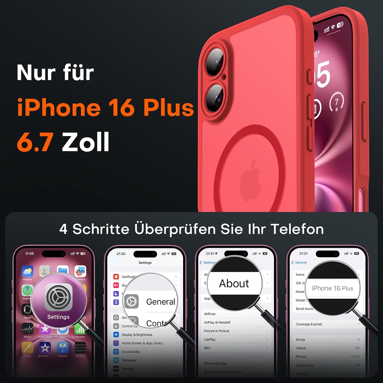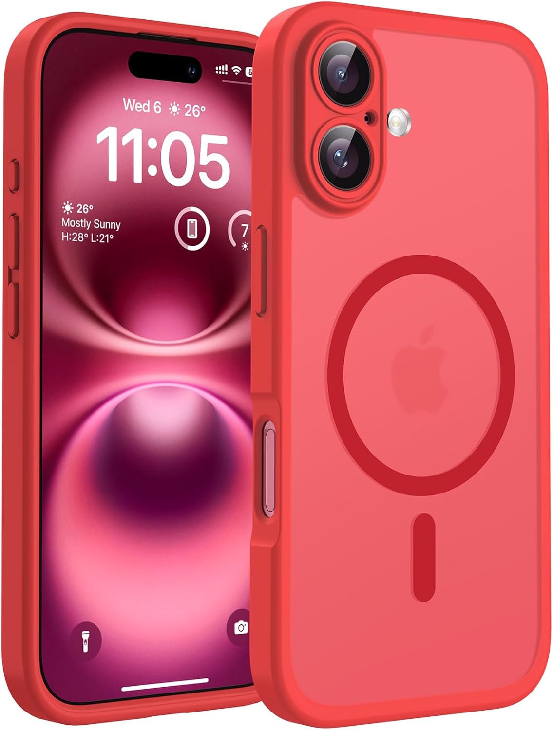 TOCOL 3-в-1 калъф за iPhone 16 Plus с Magsafe, с 2 защитни стъкла, пълна защита на камерата, удароустойчив, устойчив на надраскване, магнитен калъф за мобилен телефон за iPhone 16 Plus, червен