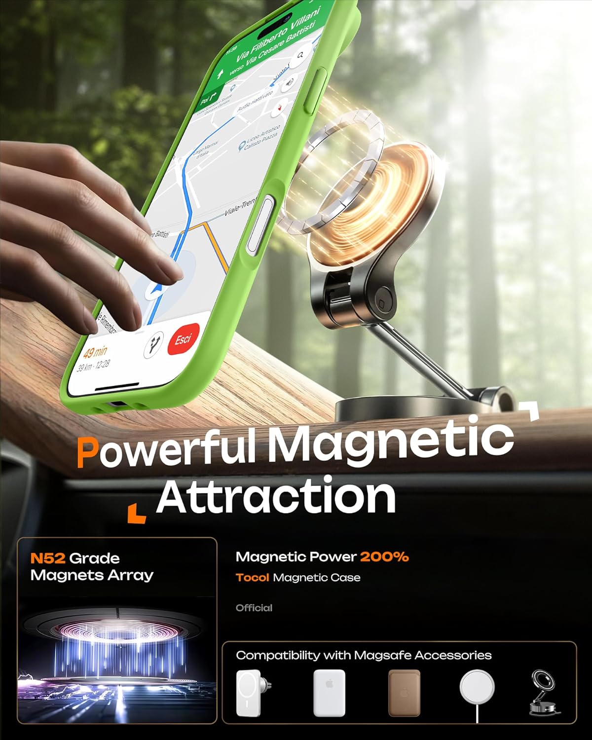 • Вграден магнитен пръстен: Магнитен калъф за iPhone 17 с вграден магнитен пръстен, никога не се разхлабва. Висока сила на задържане 20N за всички магнитни аксесоари. Остава стабилен в стойката за кола дори при тежки, неравни подове.