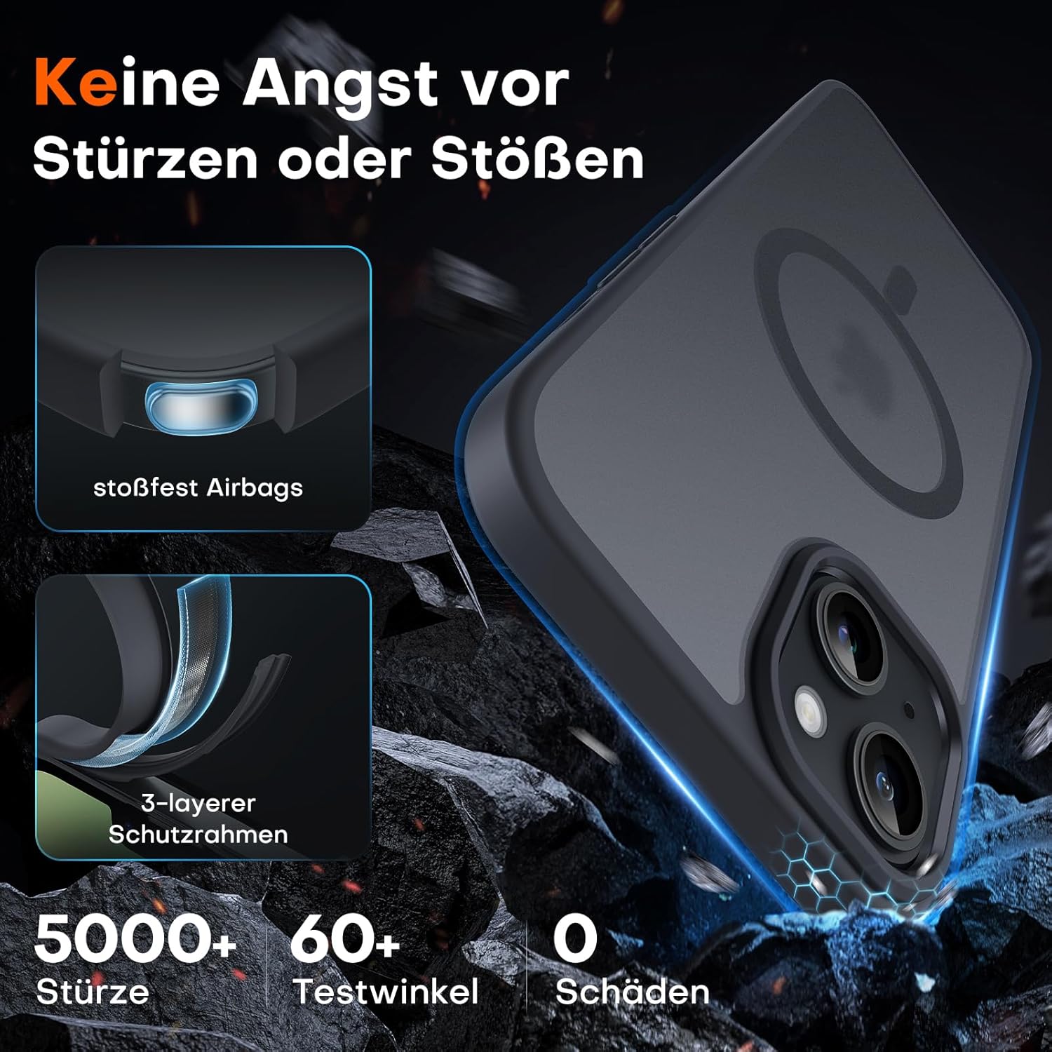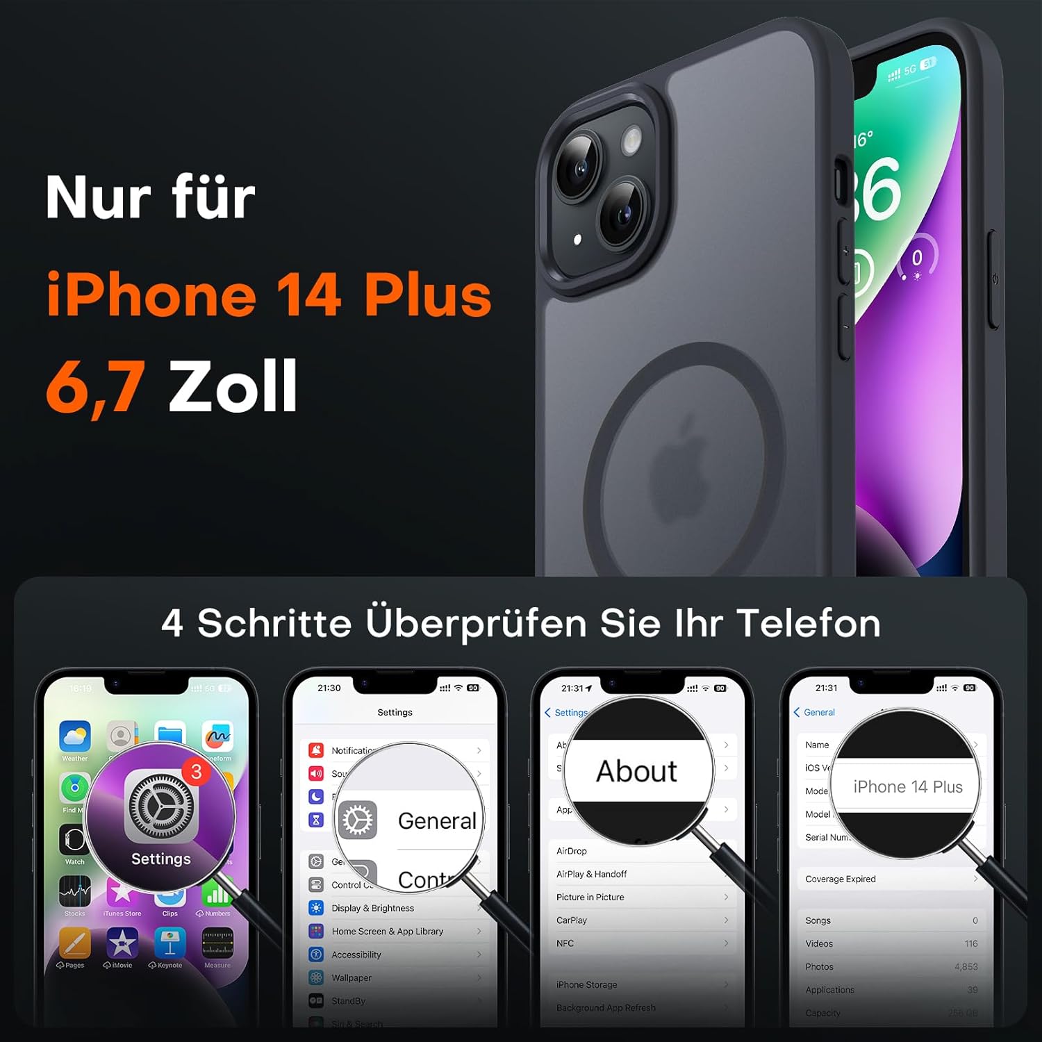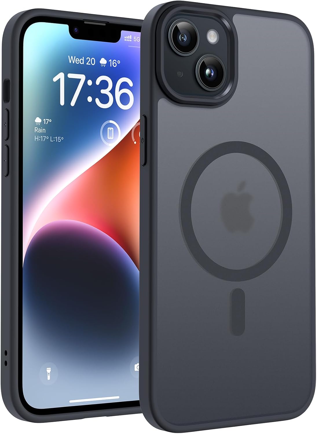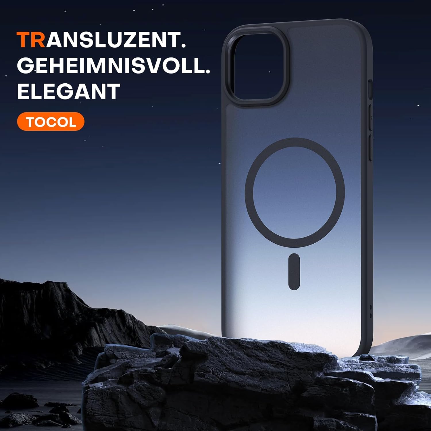 TOCOL Калъф за iPhone 14 Plus с MagSafe, Пълна защита на камерата, Вграден магнитен пръстен, Удароустойчив, Устойчив на надраскване, Прозрачен матов Калъф за мобилен телефон за iPhone 14 Plus 6.7 инча, Черен