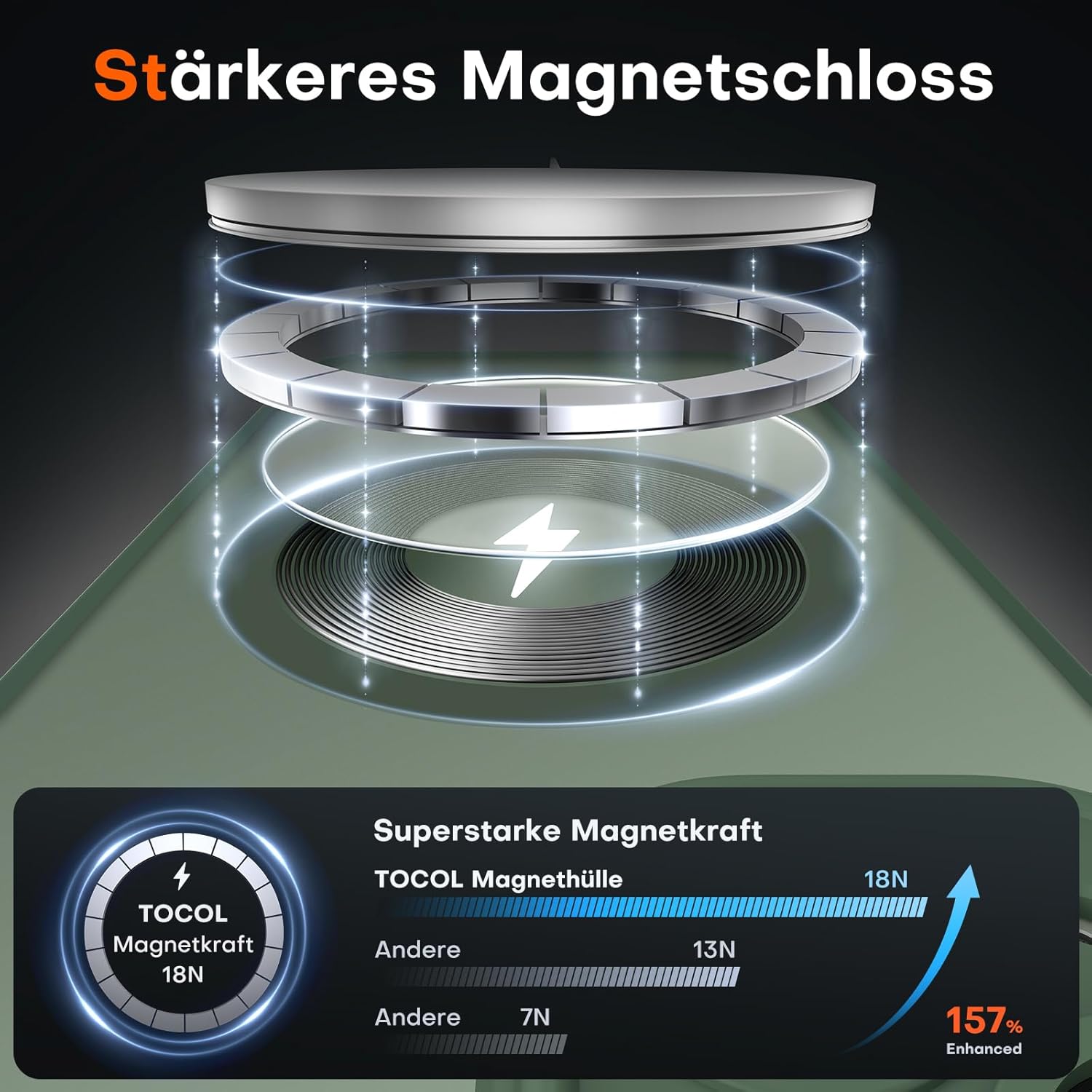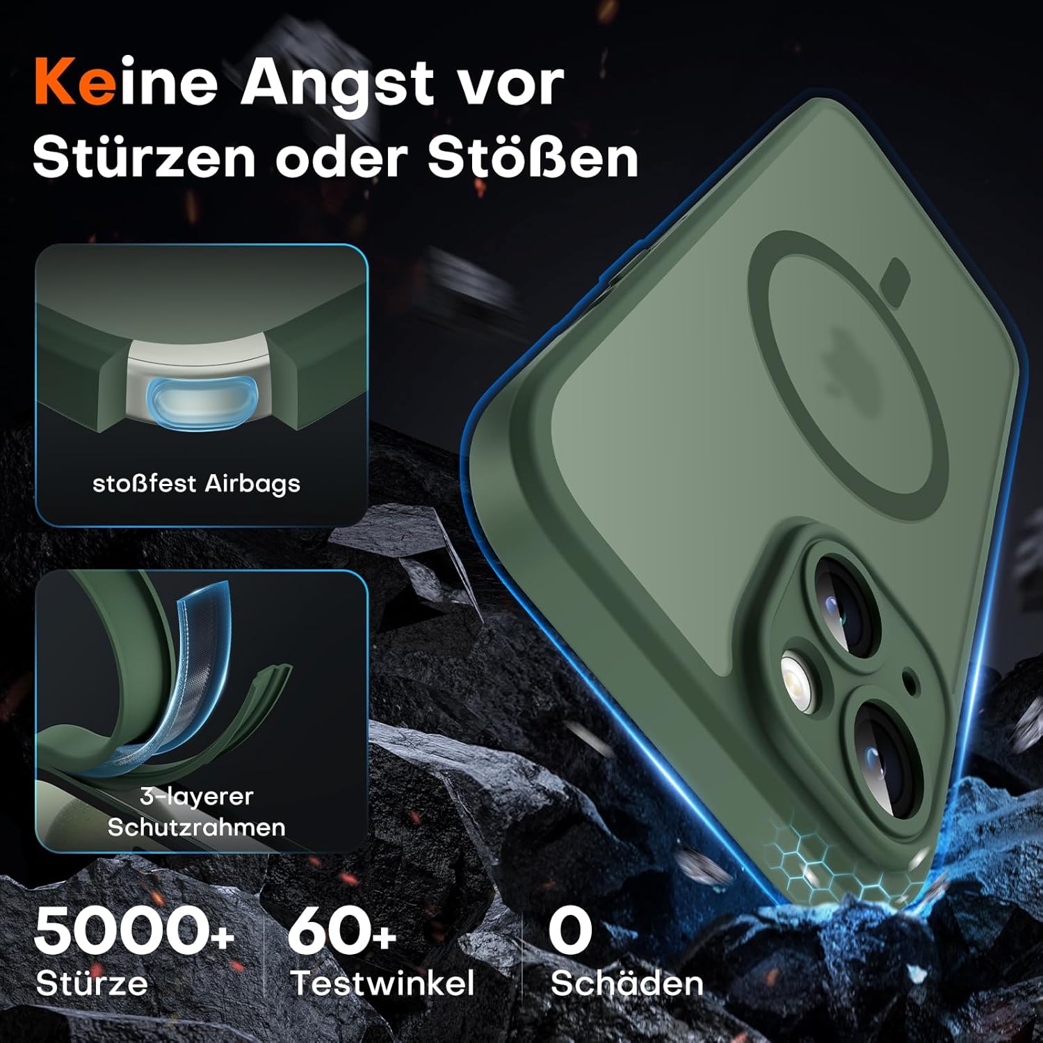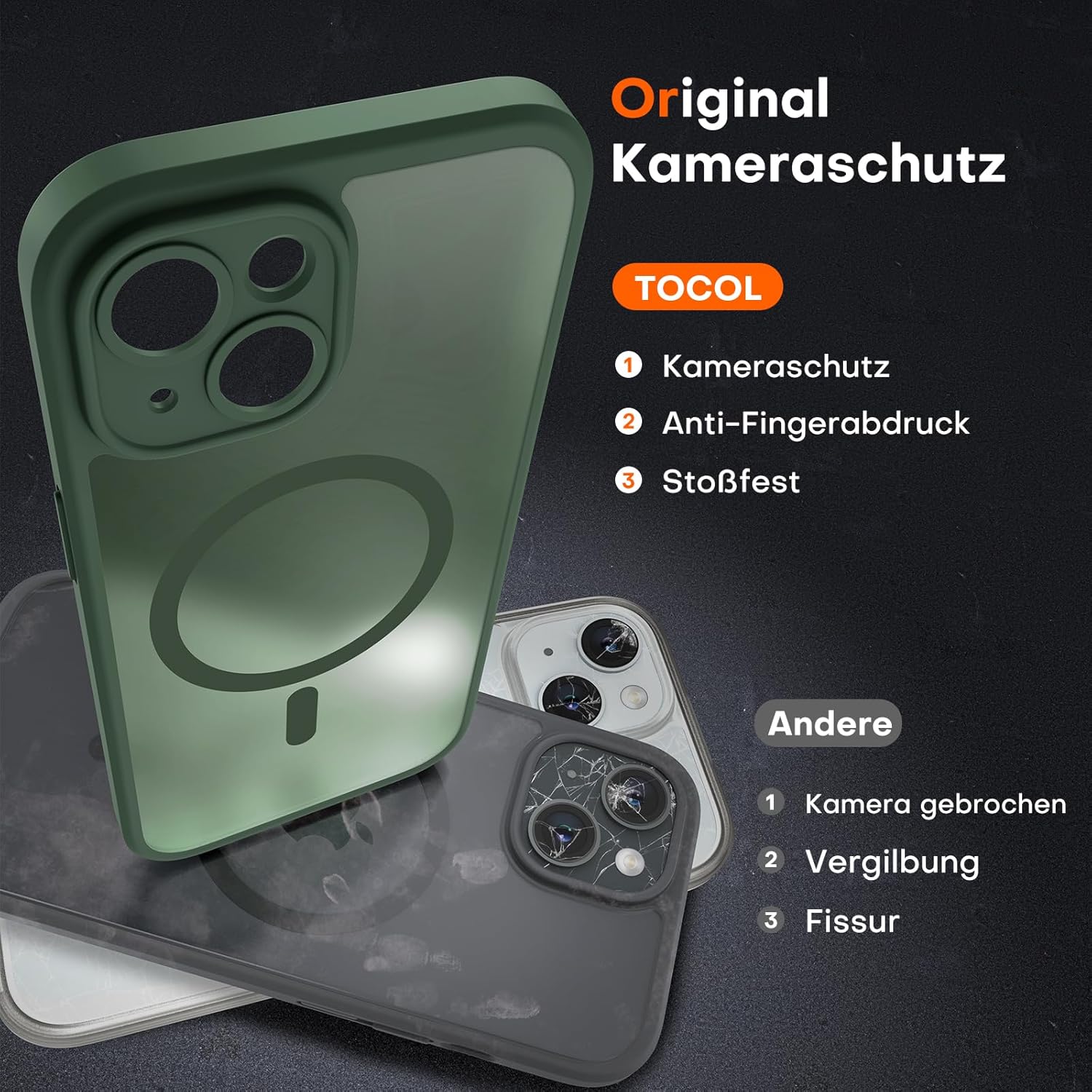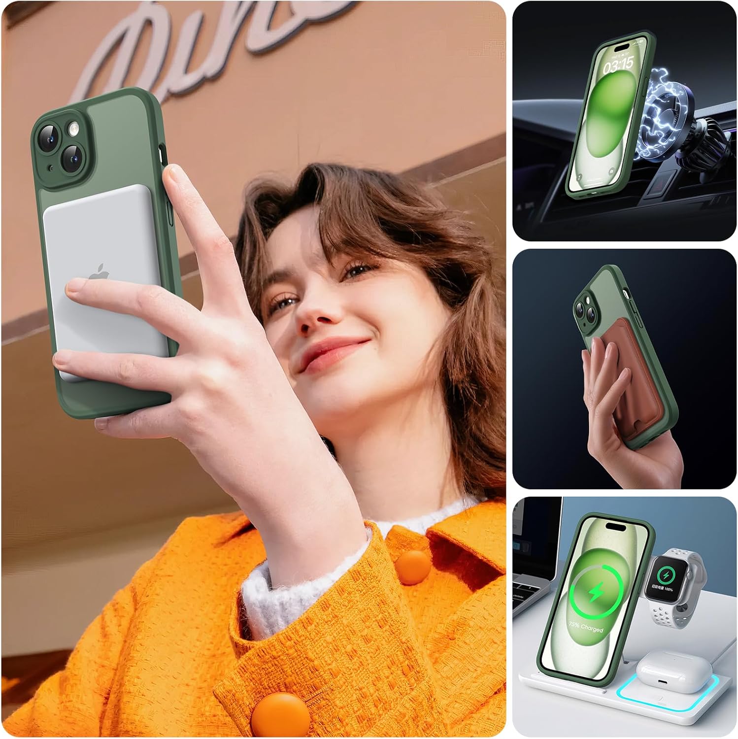 TOCOL калъф за iPhone 15, Magsafe, пълна защита на камерата, удароустойчив, устойчив на надраскване, прозрачен гръб, магнитен калъф за мобилен телефон за iPhone 15, алпийско зелено