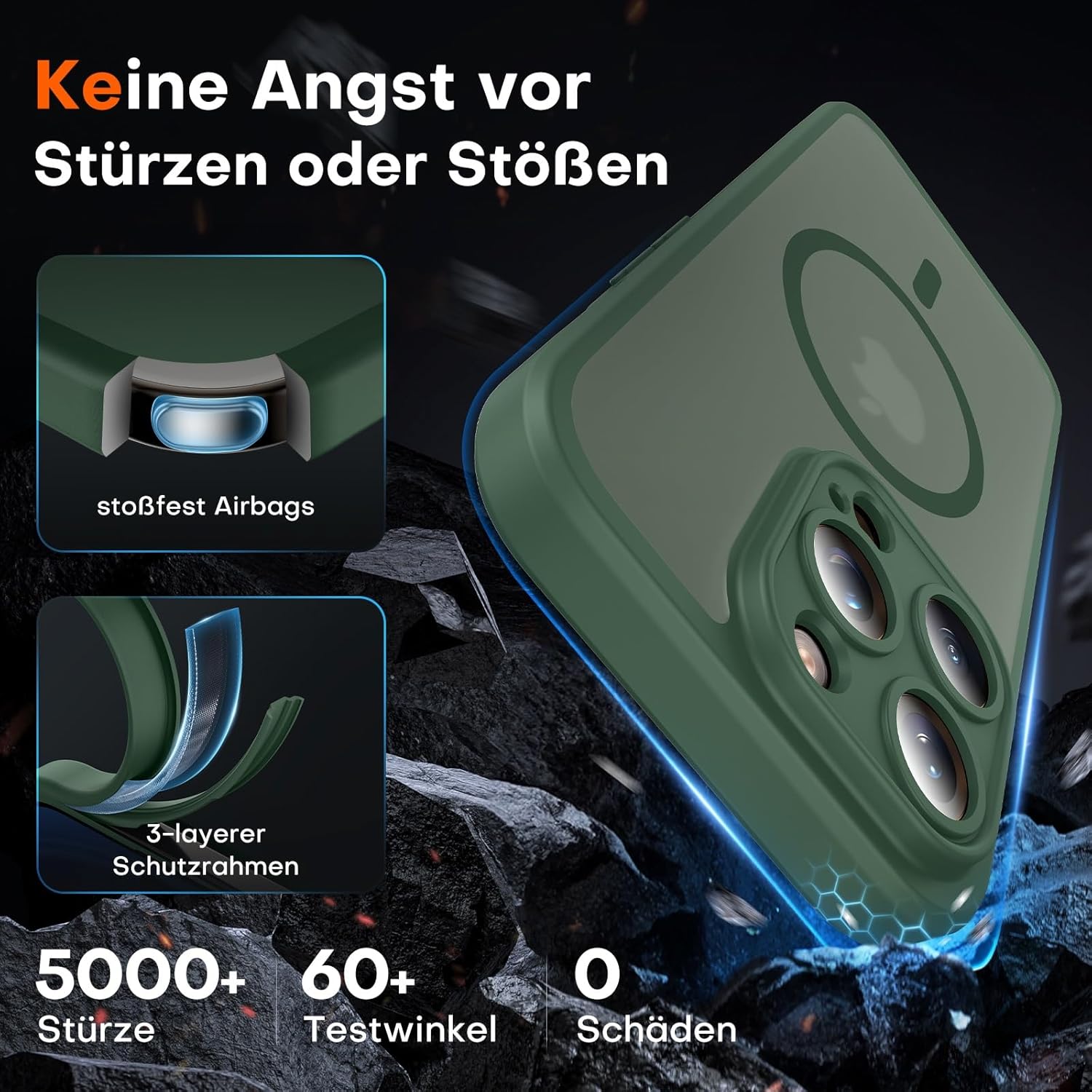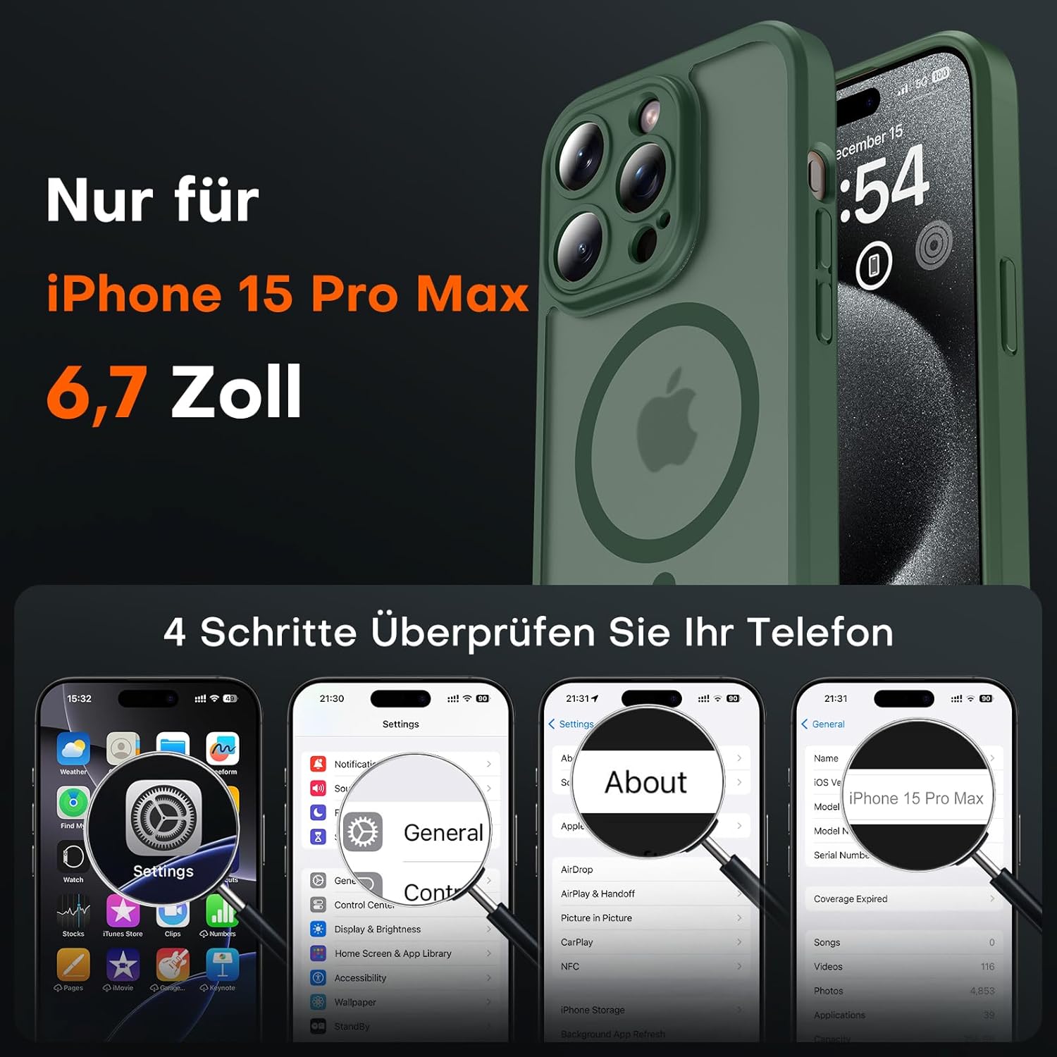 TOCOL Калъф за iPhone 15 Pro Max с Magsafe, Пълна защита на камерата, Удароустойчив, Устойчив на надраскване, Прозрачен гръб, Магнитен Калъф за Мобилен Телефон за iPhone 15 Pro Max, Алпийско Зелено