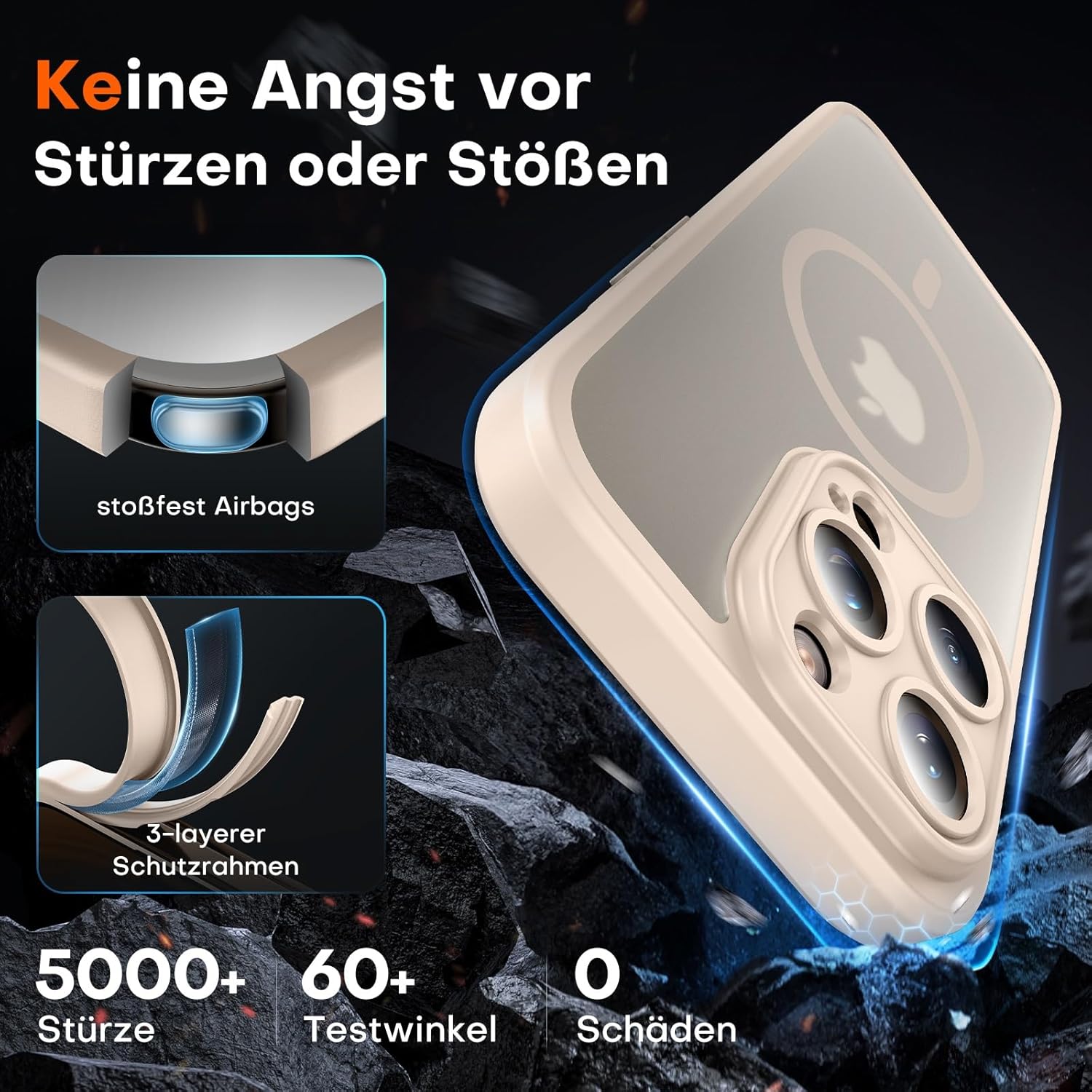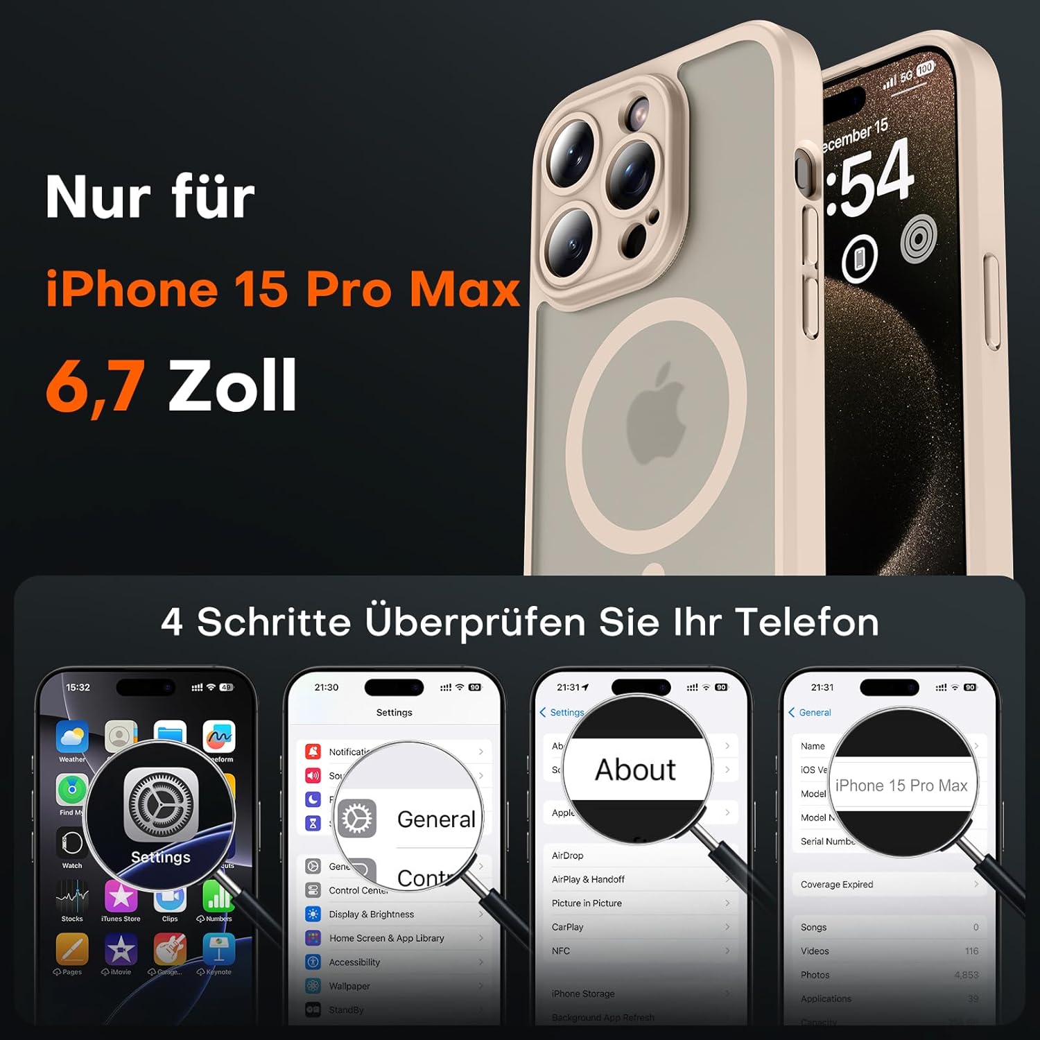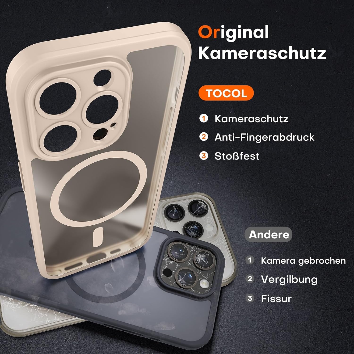 TOCOL Калъф за iPhone 15 Pro Max с Magsafe, Пълна защита на камерата, Удароустойчив, Устойчив на надраскване, Прозрачен гръб, Магнитен Калъф за Мобилен Телефон за iPhone 15 Pro Max, Пустинен Пясък