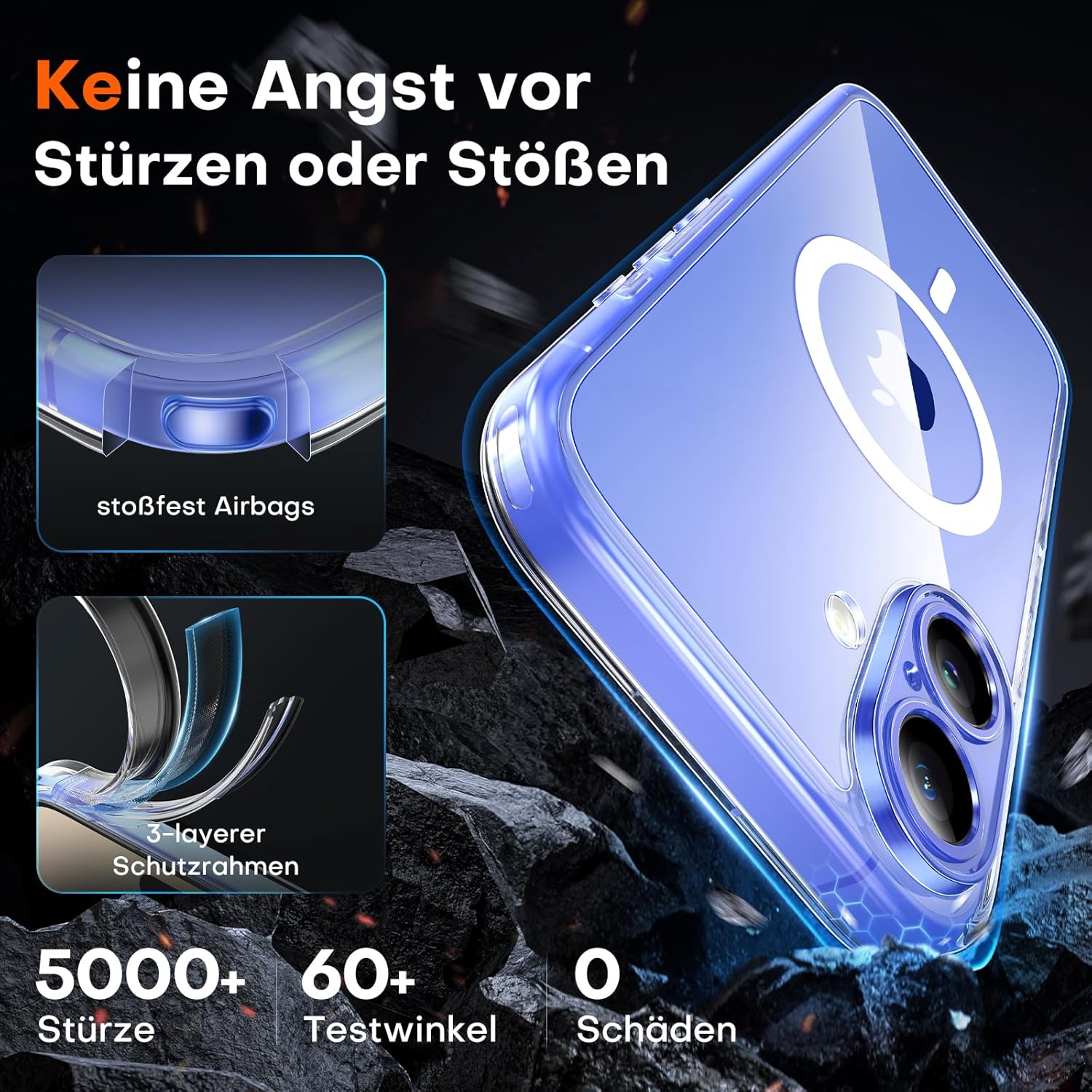 • Максимална безопасност при падане: Този калъф за iPhone 17 е изработен от термопластичен полиуретан (TPU), абсорбиращ ударите, с 4-слойна система и 360° въздушна възглавница, която ефективно намалява щетите от падане.