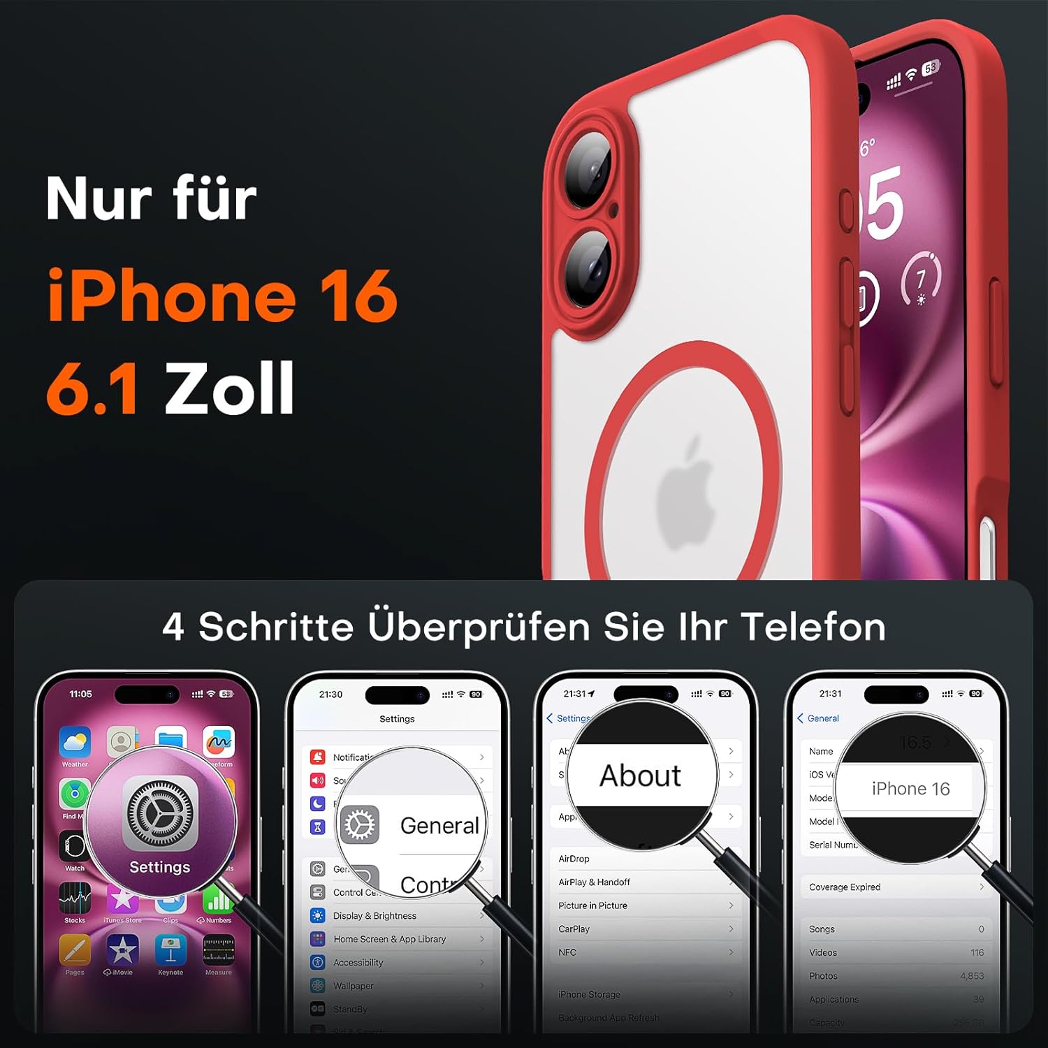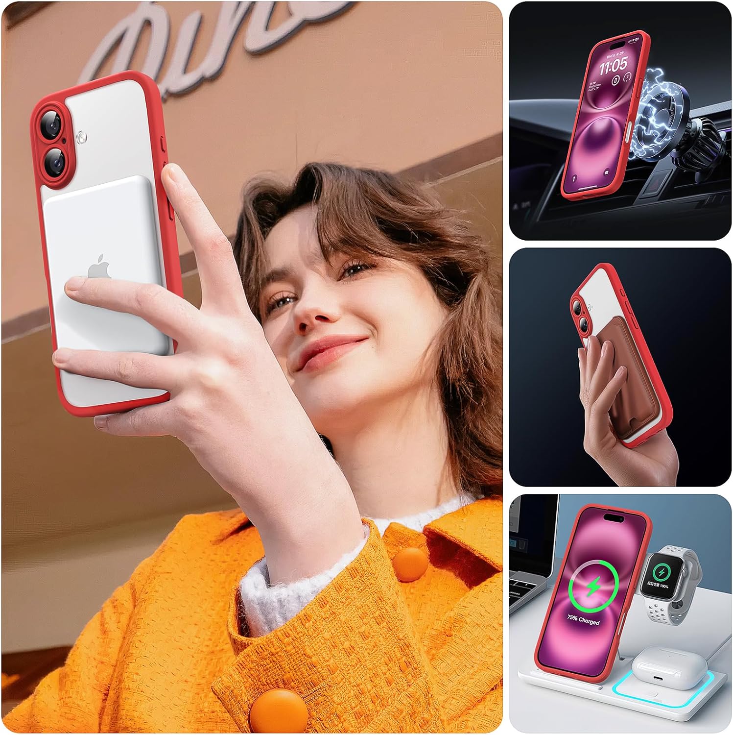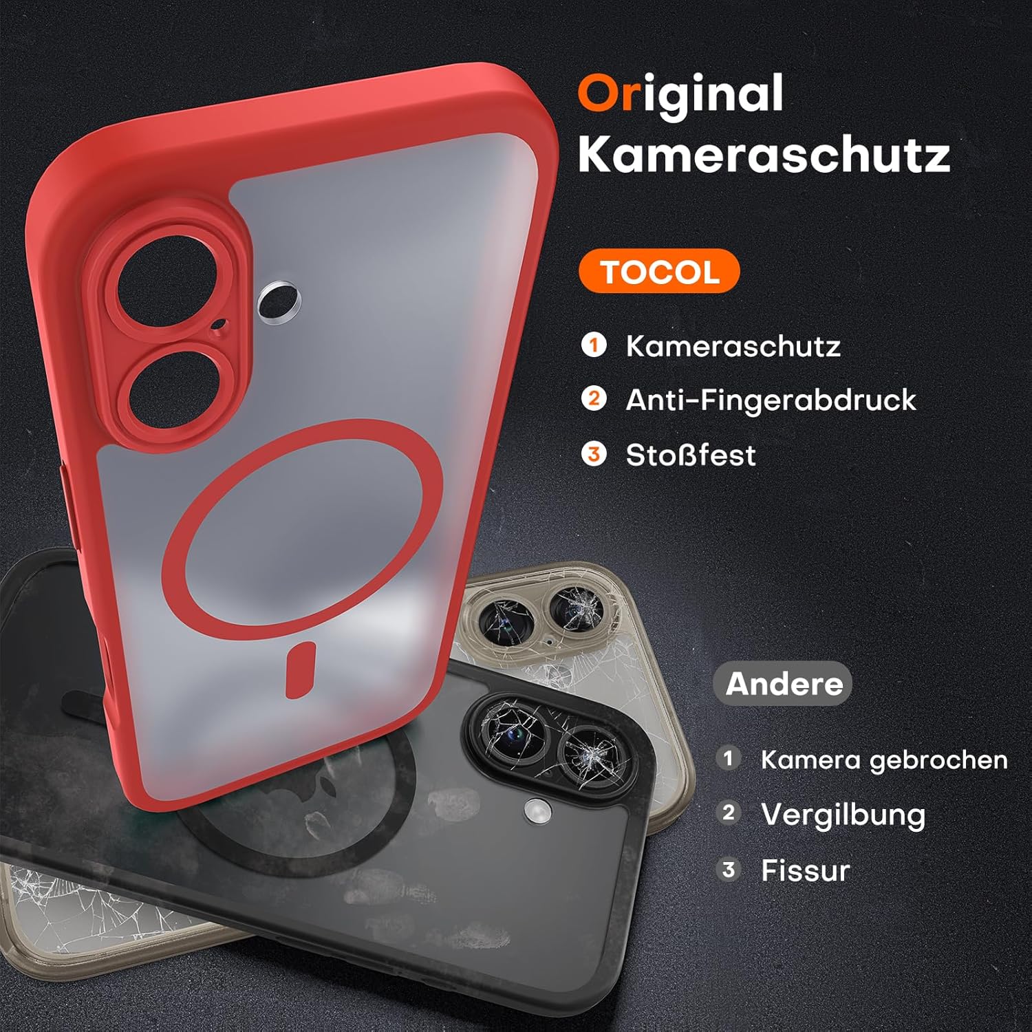 TOCOL калъф за iPhone 16, Magsafe, пълна защита на камерата, удароустойчив, устойчив на надраскване, прозрачен гръб, магнитен калъф за мобилен телефон за iPhone 16, червен