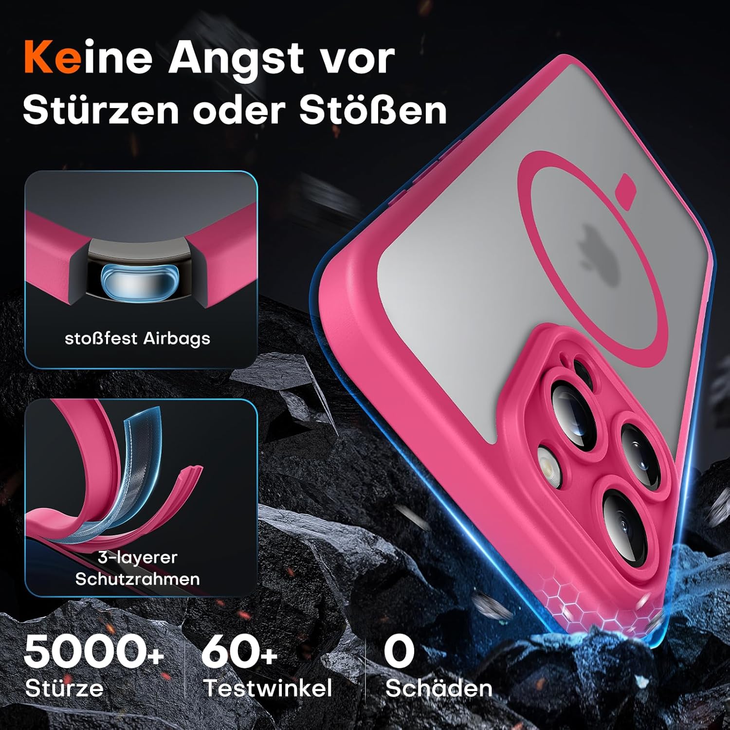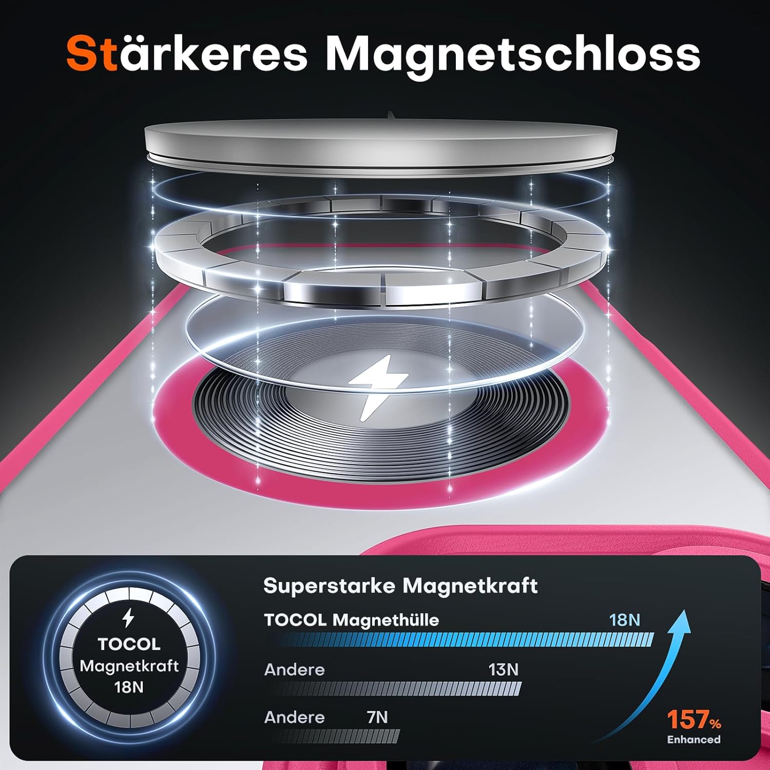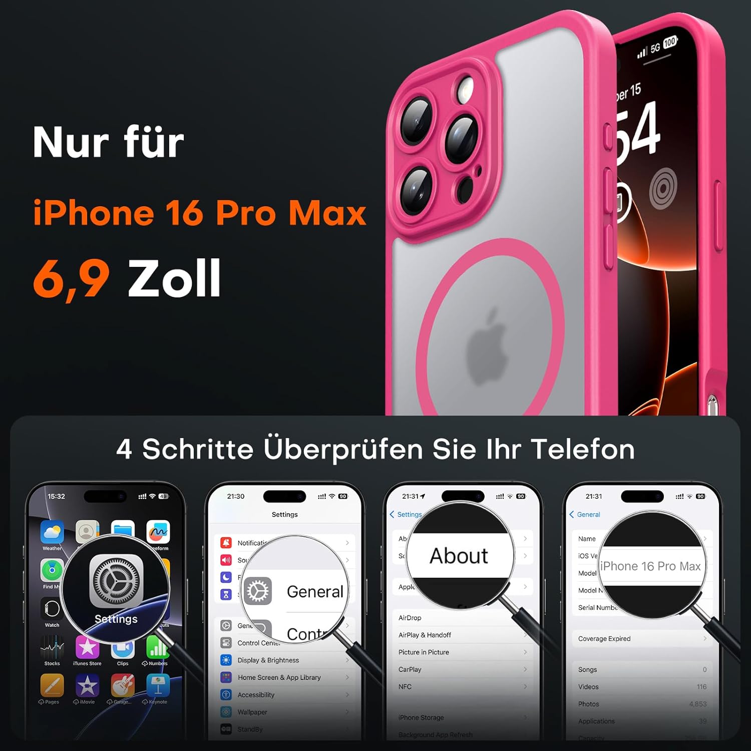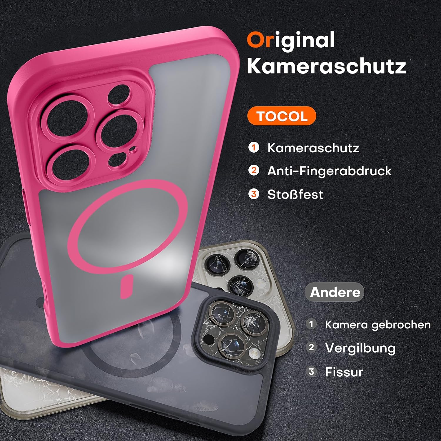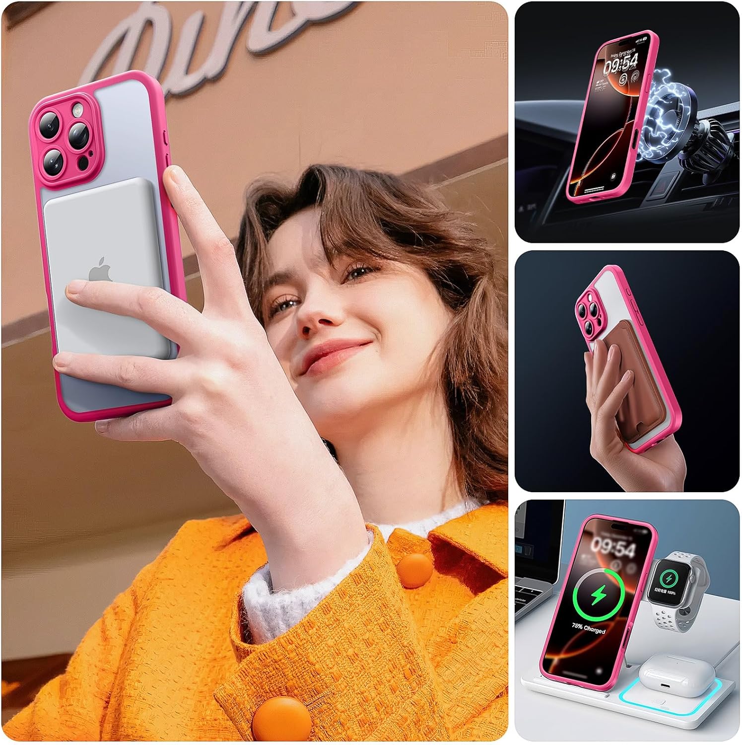 TOCOL Калъф за iPhone 16 Pro Max с Magsafe, Пълна защита на камерата, Удароустойчив, Устойчив на надраскване, Прозрачен гръб, Магнитен Калъф за Мобилен Телефон за iPhone 16 Pro Max, Ярко Розов