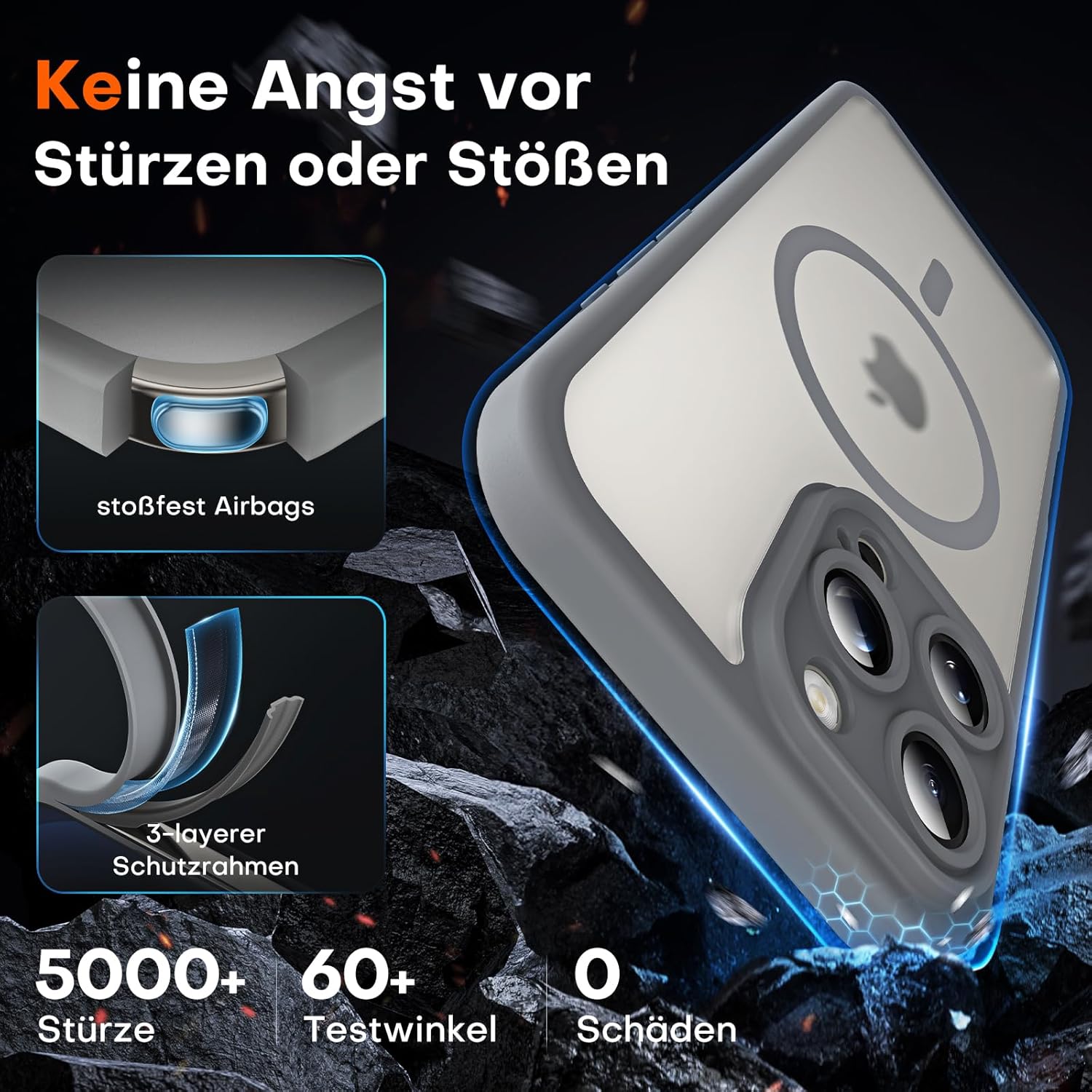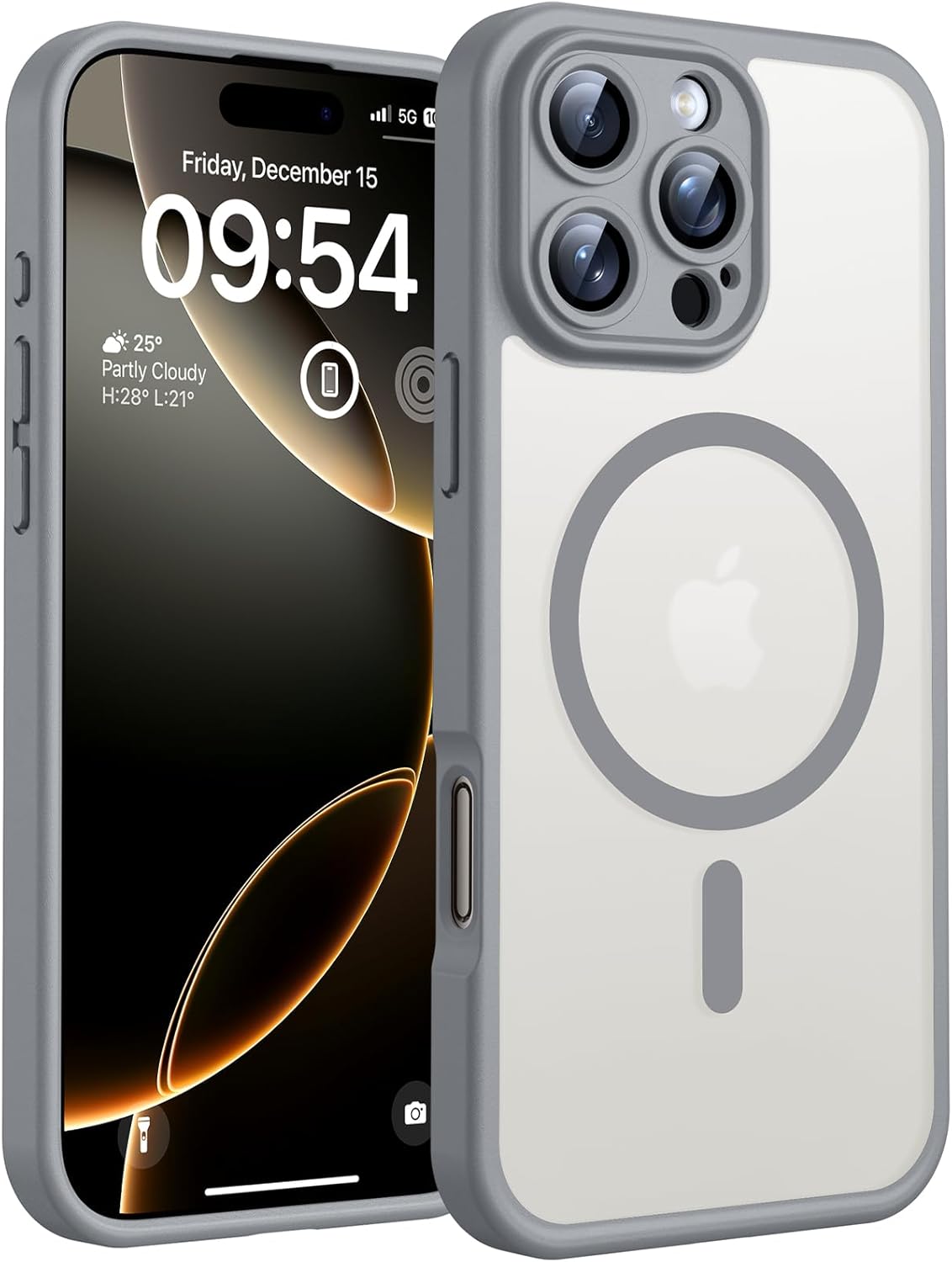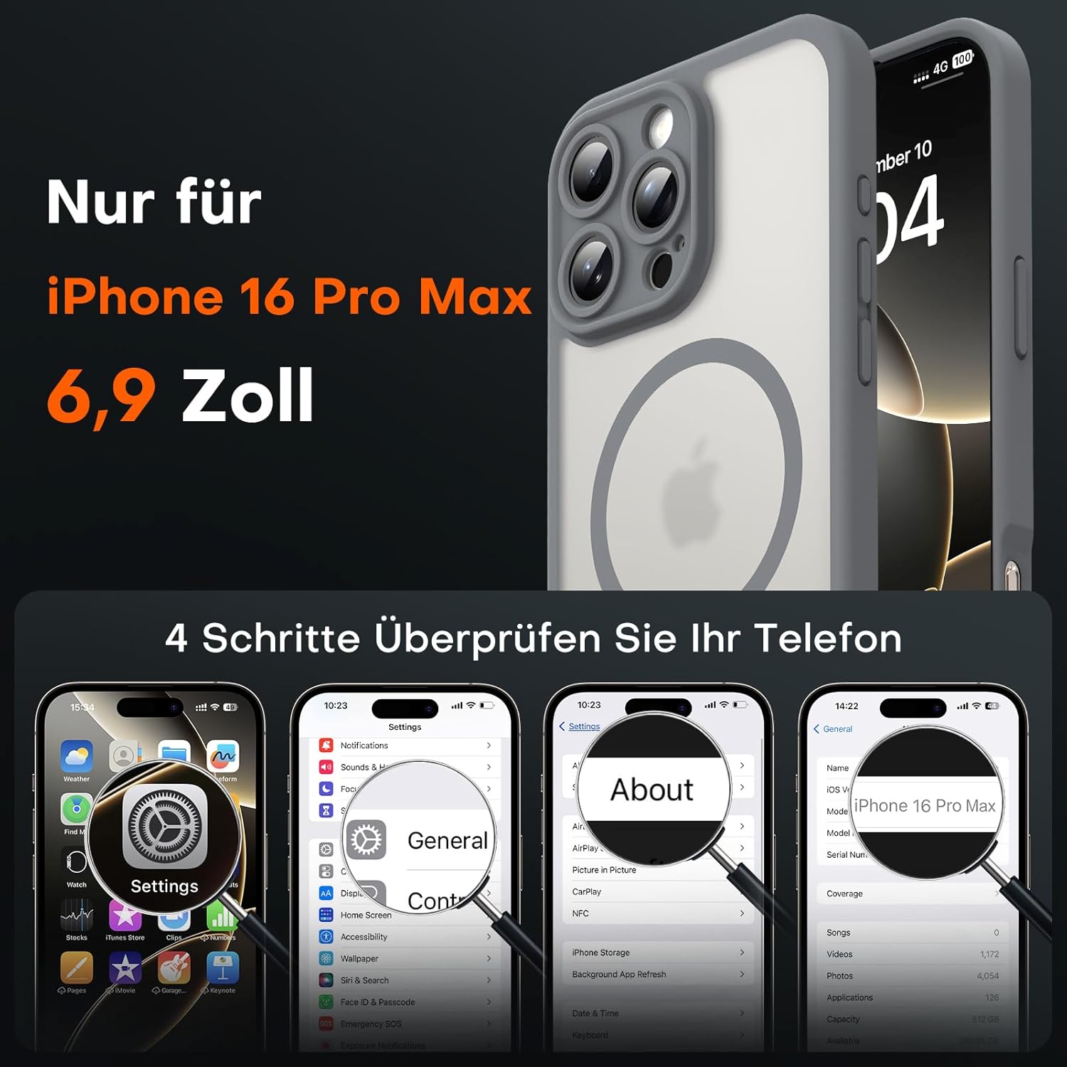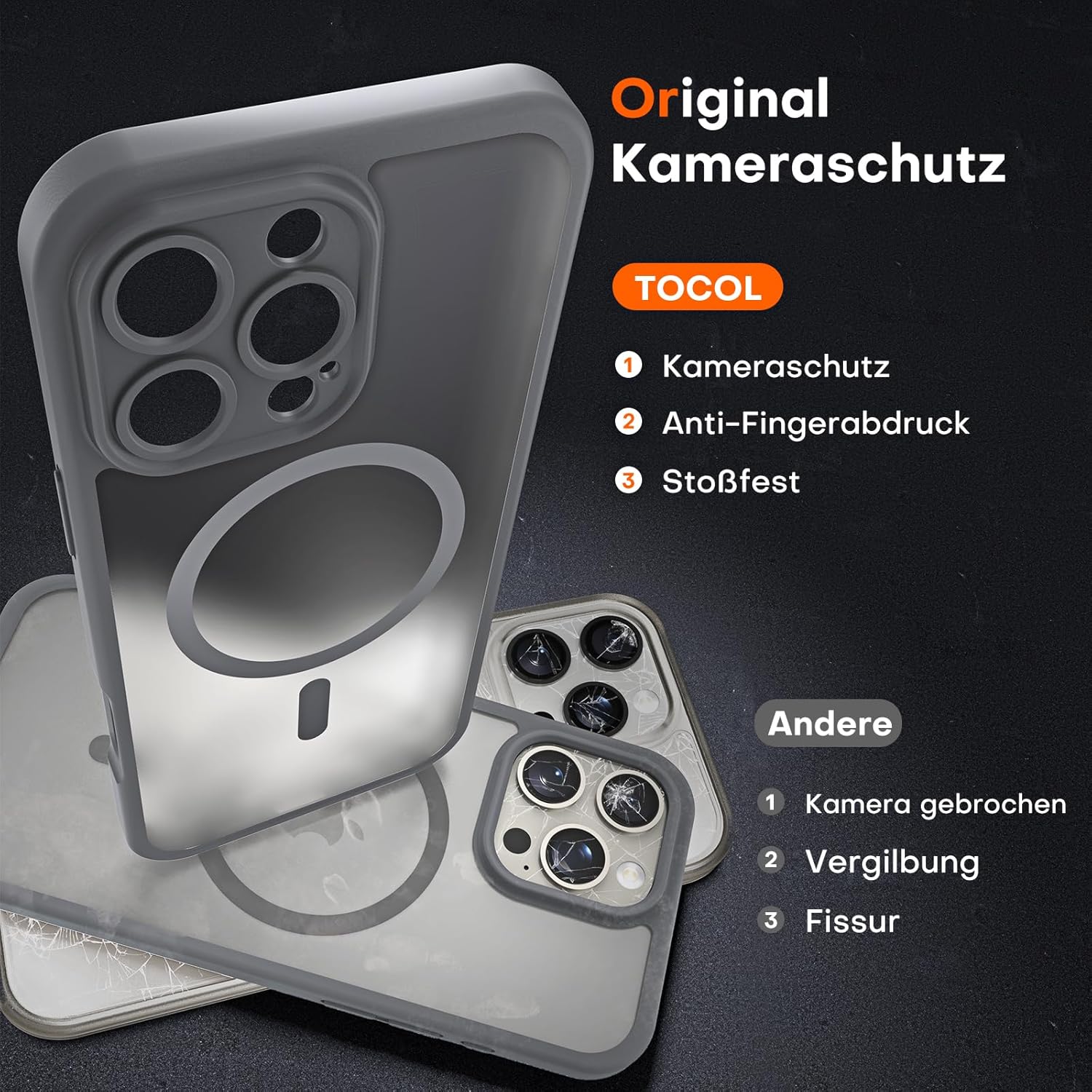 TOCOL Калъф за iPhone 16 Pro Max с Magsafe, Пълна защита на камерата, Удароустойчив, Устойчив на надраскване, Прозрачен гръб, Магнитен Калъф за Мобилен Телефон за iPhone 16 Pro Max, Сив