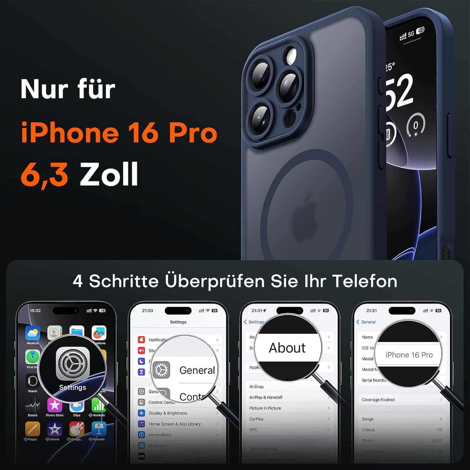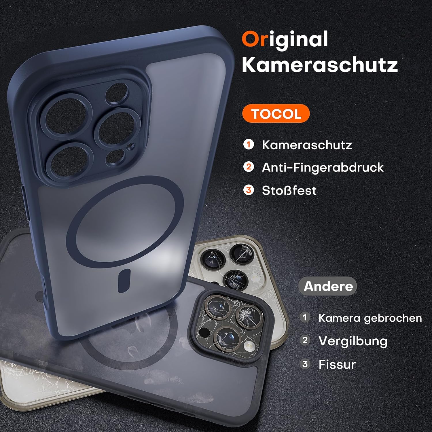 TOCOL Калъф за iPhone 16 Pro с Magsafe, Пълна защита на камерата, Удароустойчив, Устойчив на надраскване, Прозрачен гръб, Магнитен Калъф за Мобилен Телефон за iPhone 16 Pro, Син