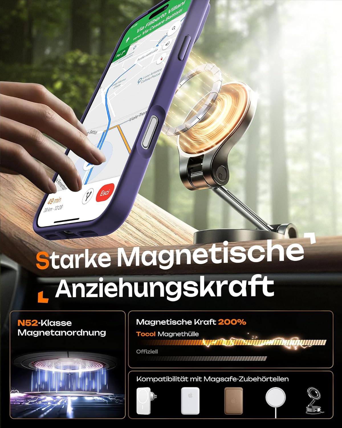 • Вграден магнитен пръстен: Магнитен калъф за iPhone 17 с вграден магнитен пръстен, никога не се разхлабва. Висока сила на задържане 20N за всички магнитни аксесоари. Остава стабилен в стойката за кола дори при тежки, неравни подове.