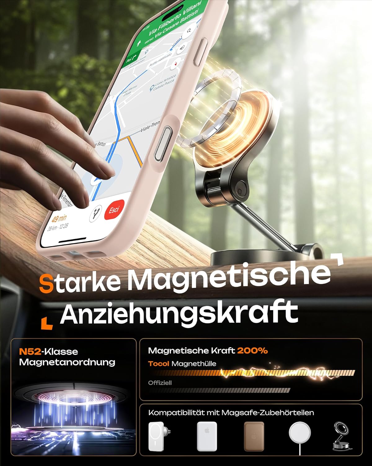 • Вграден магнитен пръстен: Магнитен калъф за iPhone 17 с вграден магнитен пръстен, никога не се разхлабва. Висока сила на задържане 20N за всички магнитни аксесоари. Остава стабилен в стойката за кола дори при тежки, неравни подове.