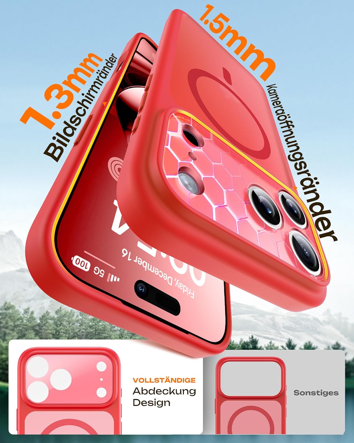 TOCOL Калъф за iPhone 17 Pro с MagSafe, Пълна защита на камерата, Вграден магнитен пръстен, Удароустойчив, Устойчив на надраскване, Прозрачен матов Калъф за мобилен телефон за iPhone 17 Pro 6.3 инча, Червен