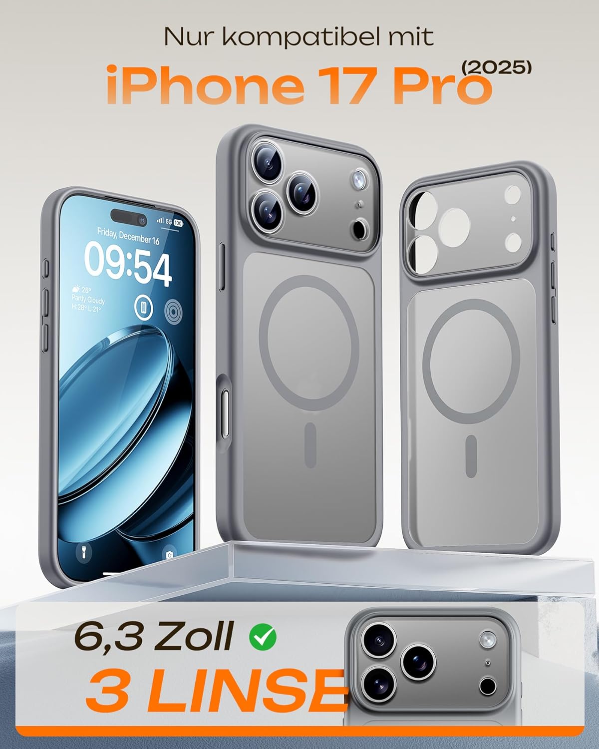 TOCOL Калъф за iPhone 17 Pro с MagSafe, Пълна защита на камерата, Вграден магнитен пръстен, Удароустойчив, Устойчив на надраскване, Прозрачен матов Калъф за мобилен телефон за iPhone 17 Pro 6.3 инча, Сив