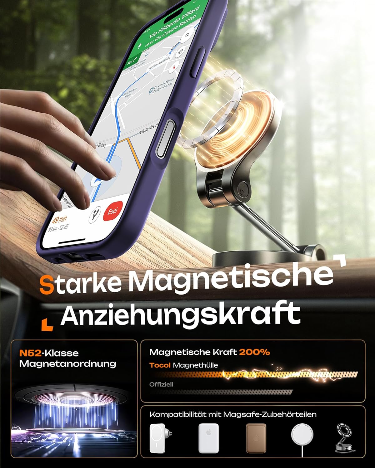 • Вграден магнитен пръстен: Магнитен калъф за iPhone 17 с вграден магнитен пръстен, никога не се разхлабва. Висока сила на задържане 20N за всички магнитни аксесоари. Остава стабилен в стойката за кола дори при тежки, неравни подове.