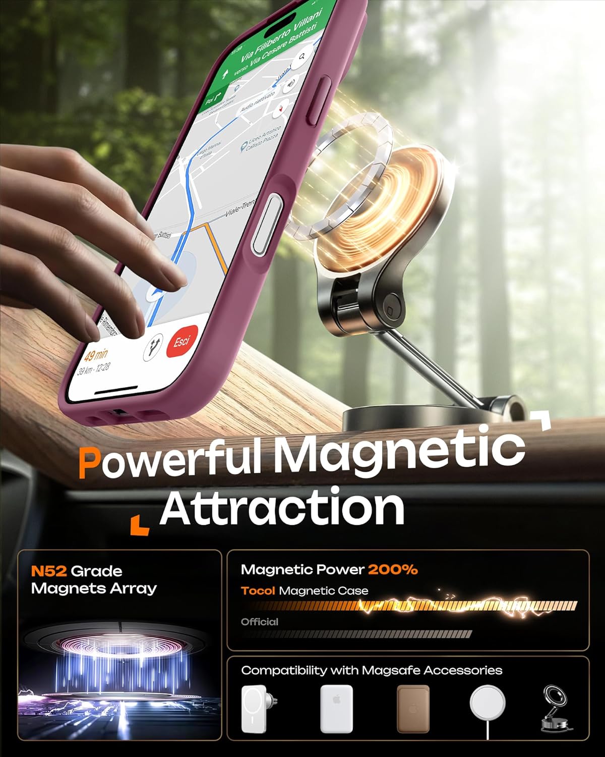 • Вграден магнитен пръстен: Магнитен калъф за iPhone 17 с вграден магнитен пръстен, никога не се разхлабва. Висока сила на задържане 20N за всички магнитни аксесоари. Остава стабилен в стойката за кола дори при тежки, неравни подове.