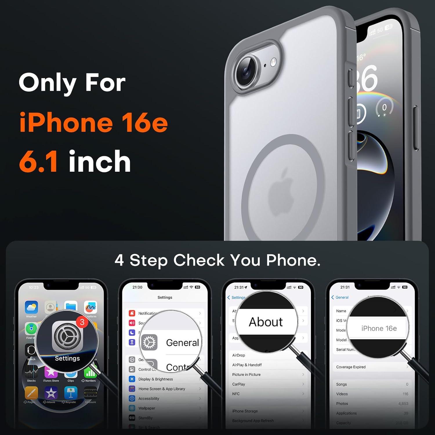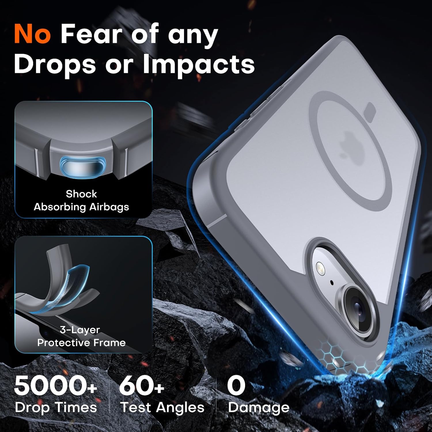 TOCOL Кейс за iPhone 16e с Magsafe покритие, Удароустойчив, Против пръстови отпечатъци, Устойчив на надраскване, Прозрачен гръб, Неплъзгащ се, Матов, Магнитен Кейс за Мобилен Телефон за iPhone 16e, Сив