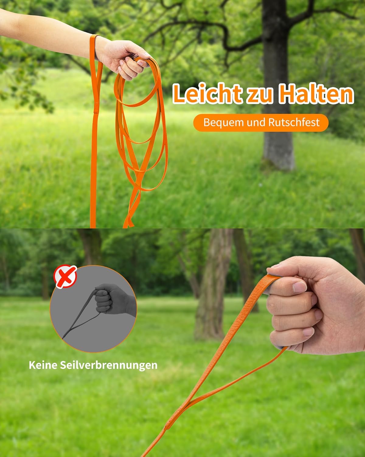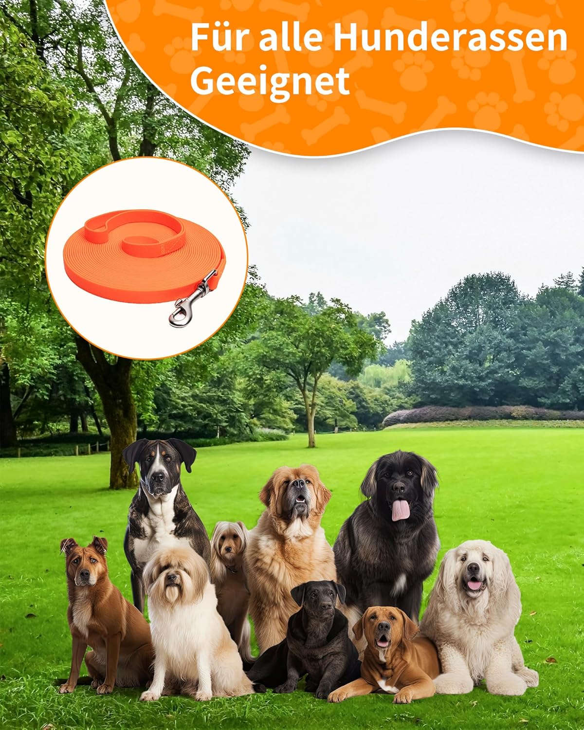 Securely attach the training rope to your dog's collar or harness. Choose the right length (5m/10m/15m/20m) depending on training needs. Use the rope in open areas to give your dog sufficient freedom of movement. After use, roll up the rope and store it in the included mesh bag. Before each use, check the rope and carabiner for damage. Make sure that the rope does not wrap around trees or other obstacles. Avoid excessive pulling to avoid discomfort for the dog. Clean the rope with a neutral detergent. Always use the rope under supervision to ensure the safety of your dog.