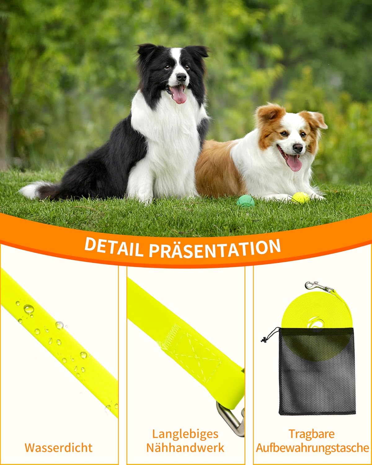 Securely attach the training rope to your dog's collar or harness. Choose the right length (5m/10m/15m/20m) depending on training needs. Use the rope in open areas to give your dog sufficient freedom of movement. After use, roll up the rope and store it in the included mesh bag. Before each use, check the rope and carabiner for damage. Make sure that the rope does not wrap around trees or other obstacles. Avoid excessive pulling to avoid discomfort for the dog. Clean the rope with a neutral detergent. Always use the rope under supervision to ensure the safety of your dog.