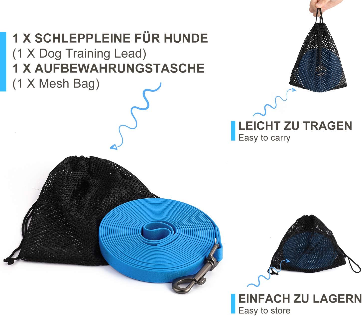 Securely attach the training rope to your dog's collar or harness. Choose the right length (5m/10m/15m/20m) depending on training needs. Use the rope in open areas to give your dog sufficient freedom of movement. After use, roll up the rope and store it in the included mesh bag. Before each use, check the rope and carabiner for damage. Make sure that the rope does not wrap around trees or other obstacles. Avoid excessive pulling to avoid discomfort for the dog. Clean the rope with a neutral detergent. Always use the rope under supervision to ensure the safety of your dog.