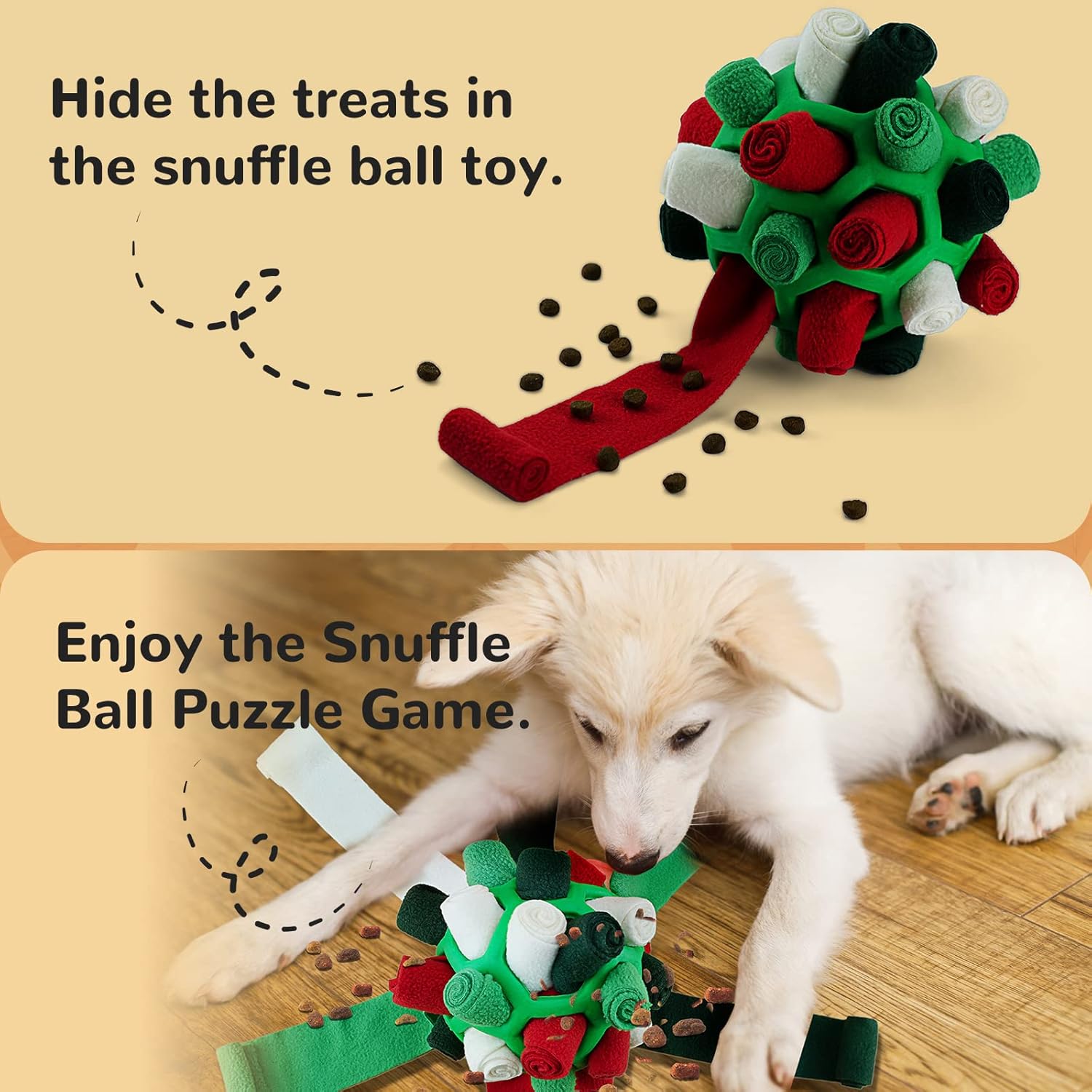 • Лесна употреба: Разхлабете края на лентата, за да поставите лакомства, след което я навийте и я поставете в отвора. Вашият домашен любимец трябва да издърпа плата от отвора на топката и след това да разхлаби плата, за да вземе храна.