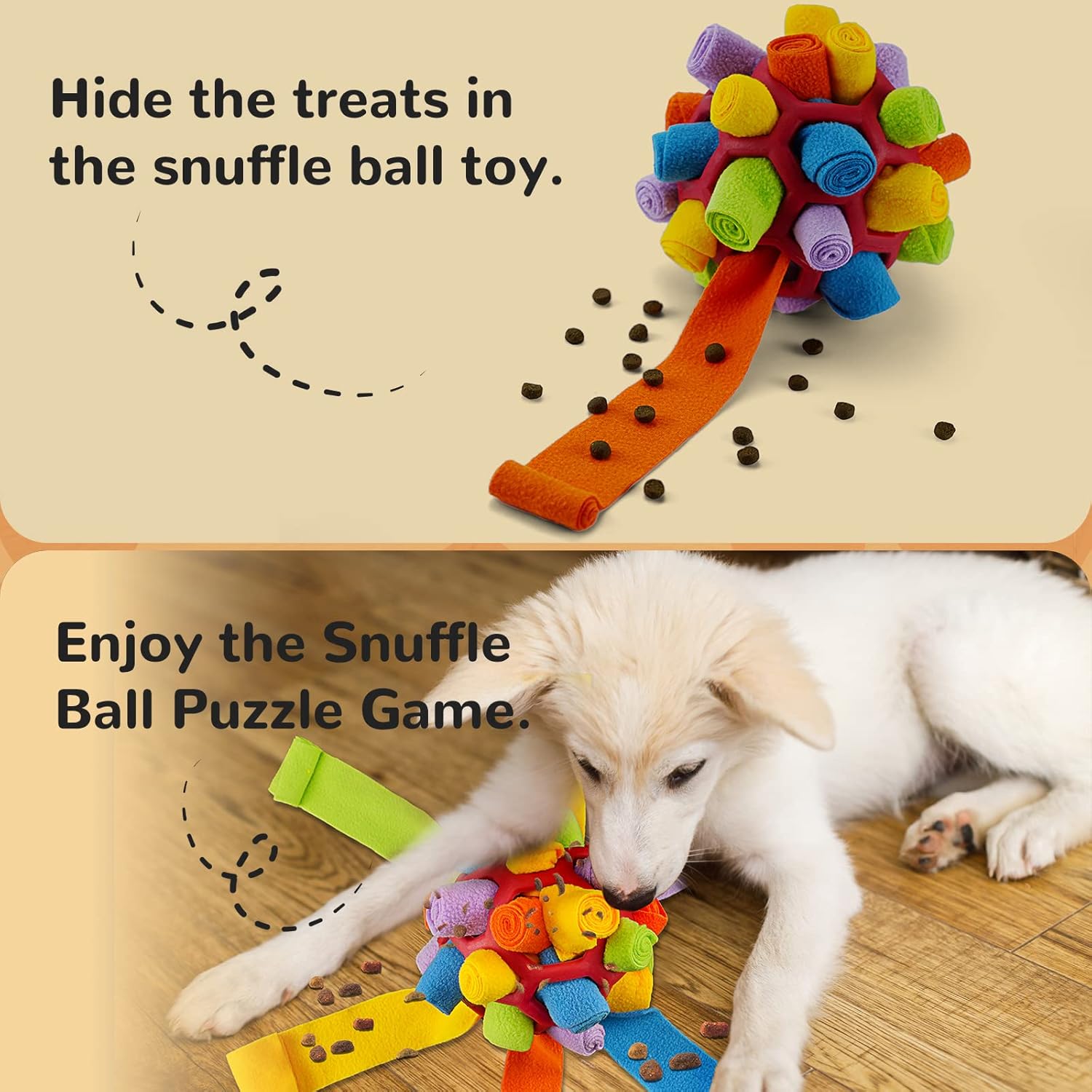 • Лесна употреба: Разхлабете края на лентата, за да поставите лакомства, след което я навийте и я поставете в отвора. Вашият домашен любимец трябва да издърпа плата от отвора на топката и след това да разхлаби плата, за да вземе храна.