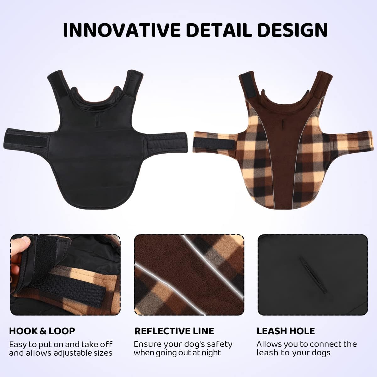 • Лесно обличане и събличане: На врата и гърдите сме използвали велкро закопчалка, която е лесна за обличане и събличане. С помощта на регулируемата драскалка можете да правите настройки, които да накарат кучето ви да се чувства по-комфортно. Това палто за кучета се предлага за повечето породи, като Теди Пай, Пудел, Шнауцер, Чихуахуа, Булдог, Голдън Ретривър, Бийгъл, Лабрадор и др.