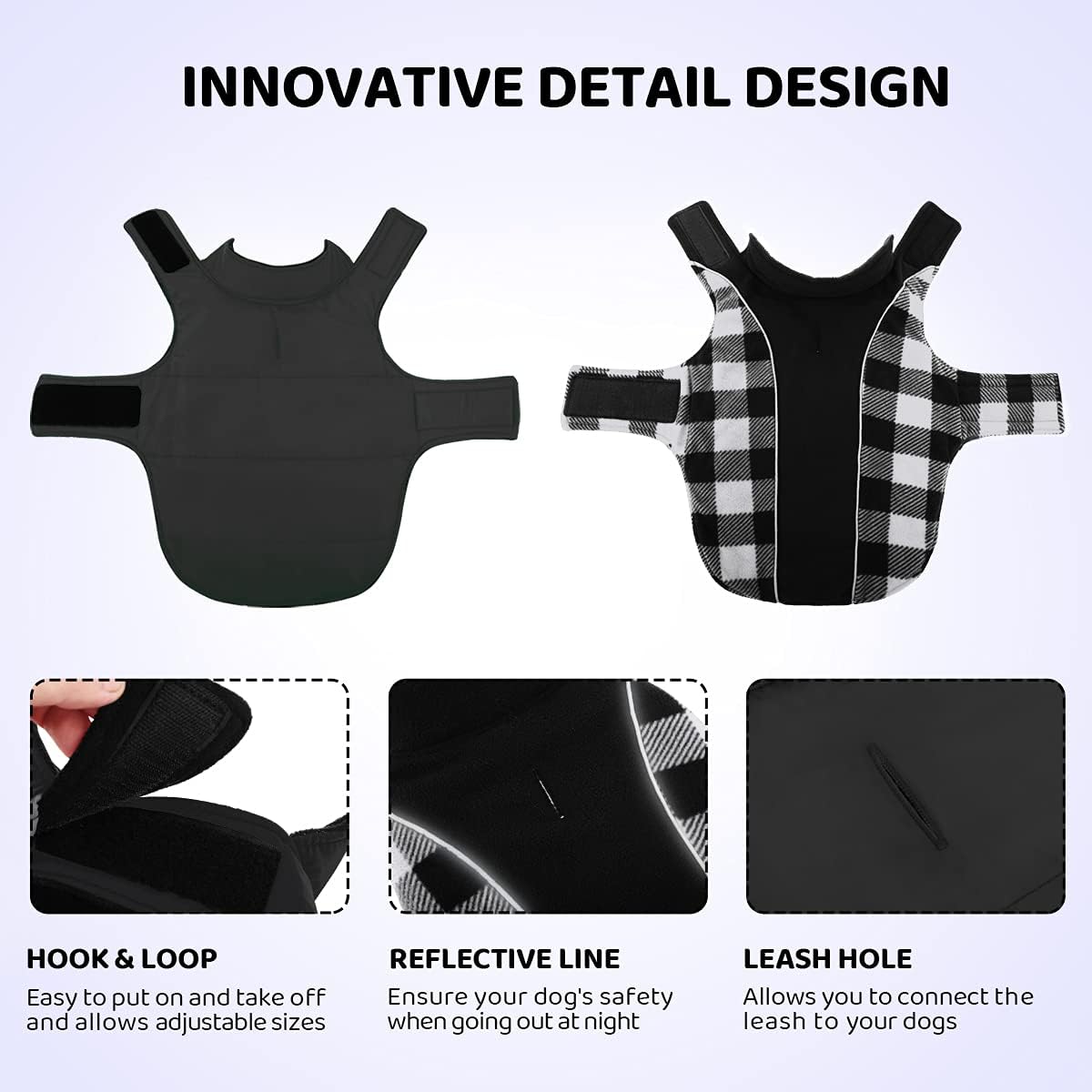 • Двуслойно палто за куче: Това трислойно зимно палто за куче е двуслойно. Едната страна е изработена от мек полар, а другата е от ветроустойчив и водоустойчив полиестер, което предпазва домашния ви любимец от намокряне в дъждовни и снежни дни. Можете да изберете подходящата страна за носене според нуждите.