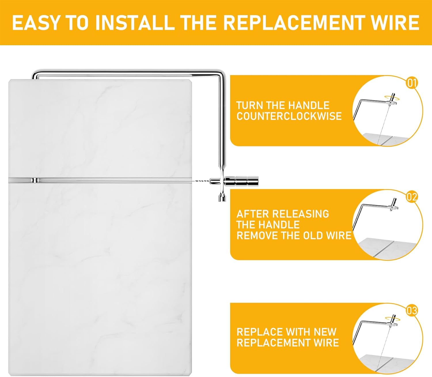• Никога повече не се тревожете за скъсани жици: Нашата машина за рязане на сирене се предлага с 5 по-дебели и по-здрави резервни жици, за да сте сигурни, че винаги сте готови да нарежете сирене. С предварително инсталирана жица и допълнителни резервни жици, никога повече няма да се налага да се тревожите за скъсана жица. Нейната издръжлива и надеждна конструкция я прави незаменимо допълнение към вашата кухня, за безпроблемно и прецизно рязане всеки път.